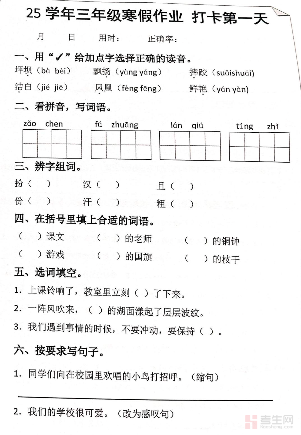 适配三年级学生 2025 寒假语文自主学习需求,打造 20 天系统化每日打卡作业,贴合低年级寒假学习节奏,是夯实语文基础、衔接下学期知识的优质寒假学习资料。本资料紧扣三年级语文核心考点,按天规划打卡内容,覆盖字词读写、古诗文积累、课内阅读、看图写话等寒假必练模块,每日任务量适中、难易适配,兼顾基础巩固与能力轻量提升,告别寒假盲目刷题。打卡内容贴合校内教学要求,题型经典、针对性强,适配学生自主打卡、每日练习,也可作为家长寒假辅导、督促孩子学习的辅助资料,助力高效利用寒假查漏补缺,筑牢语文学习根基。