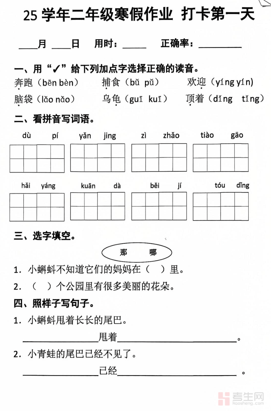 适配二年级学生 2025 寒假语文自主学习需求,打造 20 天系统化每日打卡作业,贴合低年级寒假轻松学习的节奏,是夯实语文基础、衔接下学期知识的优质寒假学习资料。本资料紧扣二年级语文核心考点,按天规划打卡内容,覆盖生字书写、词语积累、古诗记背、看图写话入门等寒假必练模块,每日任务量适中、难易适配,兼顾基础巩固与能力轻量提升,告别寒假盲目刷题。打卡内容贴合校内教学要求,题型基础经典、针对性强,适配学生自主打卡、每日练习,也可作为家长寒假辅导、督促孩子学习的辅助资料,助力高效利用寒假查漏补缺,筑牢低年级语文学习根基。