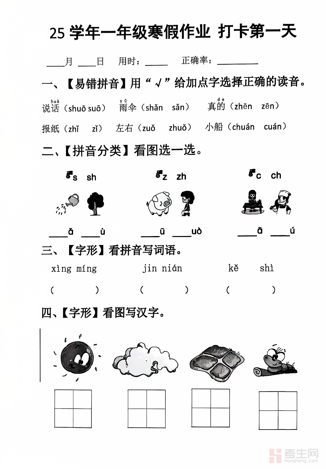 适配一年级学生 2025 寒假语文自主学习需求,打造 20 天系统化每日打卡作业,贴合低年级寒假轻松学习节奏,是夯实语文基础、衔接下学期知识的优质寒假学习资料。本资料紧扣一年级语文核心考点,按天规划打卡内容,覆盖拼音认读、生字书写、词语积累、古诗记背、看图写词等基础必练模块,每日任务量适中、难易适配,兼顾基础巩固与能力轻量提升,告别寒假盲目刷题。打卡内容贴合校内教学要求,题型基础经典、针对性强,适配学生自主打卡、每日练习,也可作为家长寒假辅导、督促孩子学习的辅助资料,助力高效利用寒假查漏补缺,筑牢一年级语文学习根基。