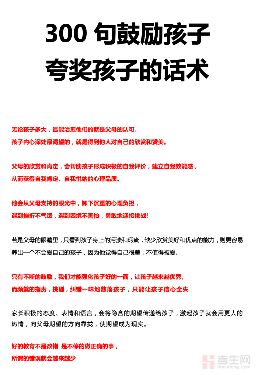 适配家长日常育儿、亲子沟通需求,精选 300 句实用鼓励夸奖口头禅,覆盖孩子学习、生活、行为习惯等多场景,是轻松做好正面管教、激发孩子内驱力的优质育儿资料。本资料摒弃空洞夸赞,每句口头禅贴合孩子成长心理,简单直白、易记易用,既能及时肯定孩子的努力与进步,也能引导孩子正视问题、主动改进,解决家长不会夸、夸不到点上的育儿难题。内容按场景分类整理,条理清晰、实用性强,适配日常亲子交流、孩子受挫鼓励、进步表扬等时刻,助力家长用正向语言滋养孩子成长,打造良好的亲子沟通氛围。