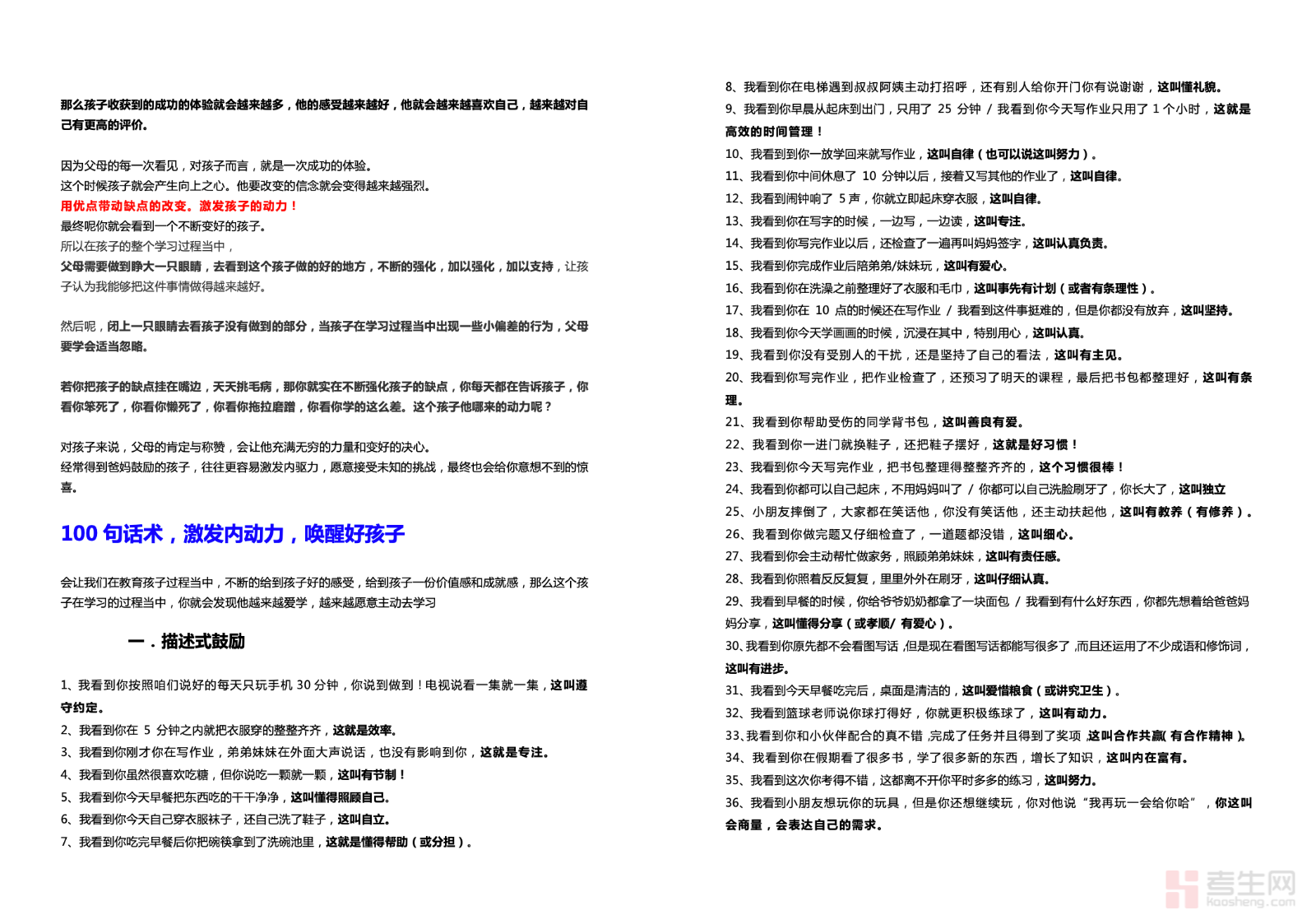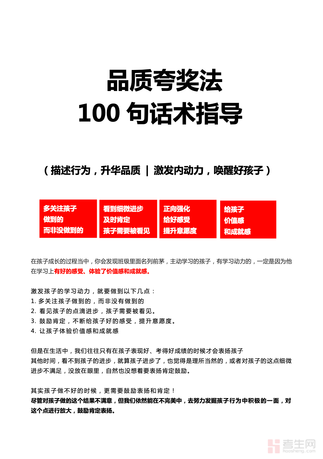 适配家长日常育儿与亲子沟通需求,聚焦品质夸奖法打造 100 句实用话术,精准挖掘孩子内在闪光点,是用正向语言激发孩子内动力、塑造优秀品格的优质育儿资料。本资料摒弃空洞的表面夸赞,从坚持、勇敢、细心、自律等核心品质切入设计话术,贴合孩子成长心理与日常学习生活场景,每句话术简单易懂、易记易用,解决家长不会夸、夸不到点上的育儿难题。内容按品质分类梳理,条理清晰、针对性强,适配日常鼓励、进步表扬、受挫引导等时刻,助力家长以专业夸奖滋养孩子成长,唤醒孩子自主成长的内驱力。