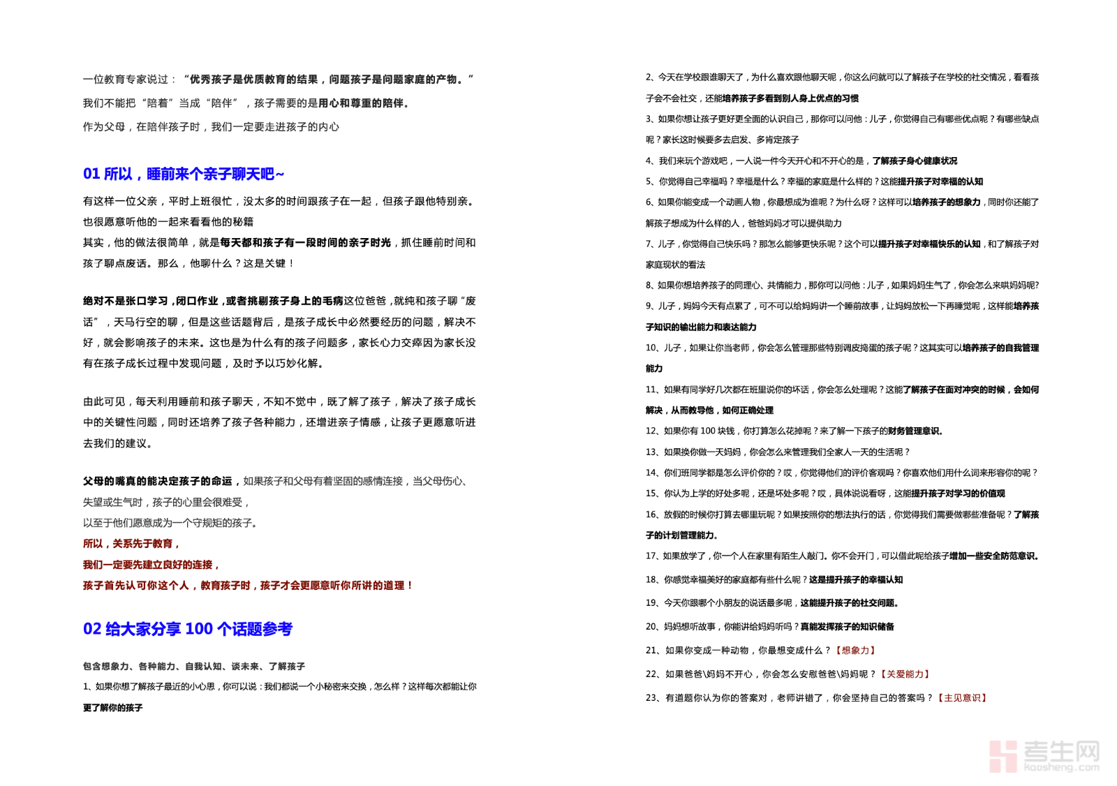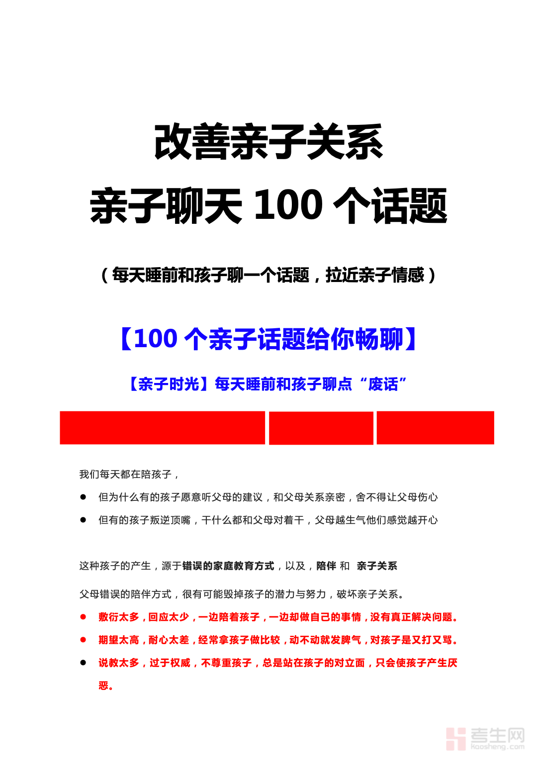 适配家长日常亲子沟通需求,精选 100 个实用聊天话题,破解亲子沟通无话题、交流不深入的难题,是拉近亲子情感、让家庭教育更顺畅的优质育儿资料。本资料覆盖孩子学习、生活、兴趣、成长感悟等多维度话题,贴合不同年龄段孩子的心理特点,话题轻松易懂、引导性强,既能打开孩子的话匣子,也能让家长更了解孩子内心想法,让亲子交流告别说教、充满温度。内容分类清晰、即取即用,适配日常陪伴、饭后闲谈、睡前交流等场景,助力搭建良好亲子沟通桥梁,让孩子更愿意配合,让家庭教育事半功倍。