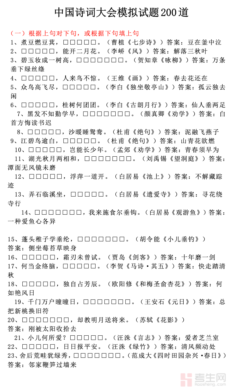 适配中小学生诗词积累、诗词竞赛备考及诗词爱好者自测提升需求,精选 200 道中国诗词大会模拟试题,复刻节目题型风格,兼顾知识性与趣味性,是夯实诗词基础、提升诗词素养的优质练习资料。本资料紧扣中华经典诗词核心,覆盖唐诗、宋词、元曲等经典篇目,题型涵盖诗句接龙、填字补句、作者匹配、诗意理解等,贴合诗词大会考法。试题难度分层合理,解析简洁易懂,针对性解决诗词记不牢、理解不深、答题失误等问题,适配学生日常练习、竞赛冲刺,也可作为亲子诗词互动、诗词爱好者自测的辅助资料,助力感受诗词魅力,筑牢经典积累根基。