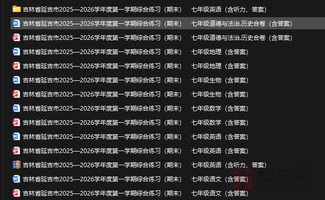 吉林省延吉市2025—2026学年度第一学期综合练习(期末)七年级试卷(含答案)内容简介 本试卷适用于吉林省延吉市七年级学生2025—2026学年度第一学期期末综合复习与检测,贴合当地教学进度及命题风格,配套完整参考答案,便于自查自纠。考查范围覆盖七年级上册各核心学科(语文、数学、英语、道德与法治、历史、地理、生物),严格依据各学科课标及人教版教材编写,涵盖本学期所学全部基础知识点与重点难点,兼顾基础考查与能力提升,贴合吉林地区“重实践、强基础”的命题特点。 题型分布贴合延吉市七年级期末考常规样式,各学科均包含基础题型与提升题型:语文涵盖语言积累与运用、阅读、写作及卷面书写;数学包含选择题、填空题、解答题,基础题占比超七成,搭配适量拔高题;英语涵盖听力理解、单项选择、完形填空、阅读理解、书面表达;史地生及道法以选择题、填空题、简答题(材料分析题)为主,全面考查学生知识识记与应用能力。 本试卷使用场景灵活,可作为延吉市七年级学生期末考前综合演练、查漏补缺的核心资料,帮助学生熟悉期末考题型、把控答题节奏;也可作为教师期末复习备课、学情检测的辅助工具,精准掌握学生知识掌握情况;同时适用于家长辅导孩子期末复习,快速定位薄弱环节,针对性提升,助力学生高效备考、顺利通过期末检测。