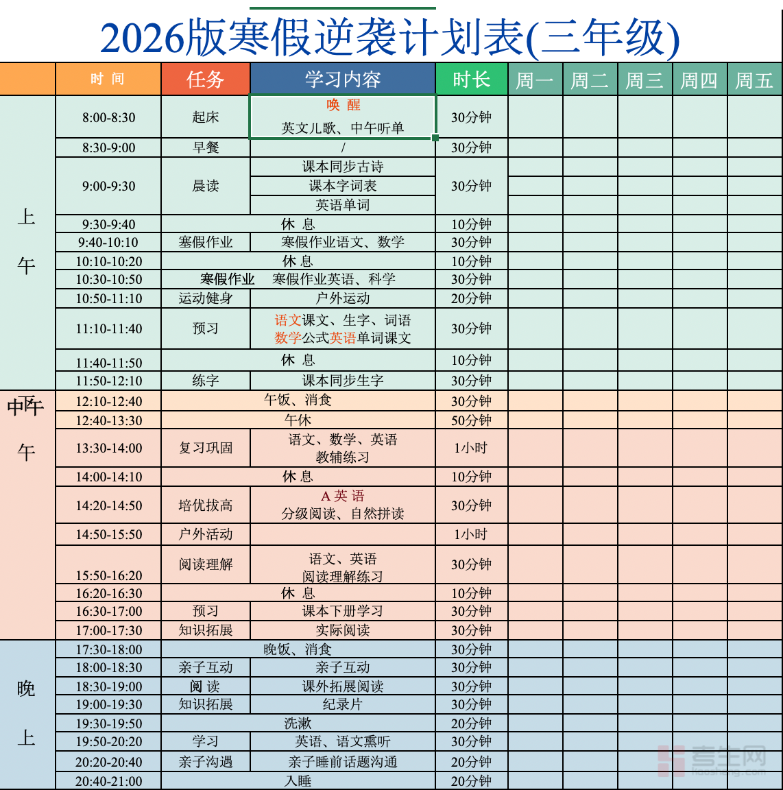 适配三年级学生寒假全科学习衔接、基础巩固与新学期预习提升需求,量身打造专属寒假逆袭计划表,科学规划假期学习节奏,兼顾知识复盘与能力进阶,是高效利用寒假、实现开学稳步赶超的实用学习资料。本资料紧扣三年级语文、数学、英语核心知识点,精准衔接秋学期知识重点与春学期预习要点,计划表按每日合理拆分学习任务,涵盖基础巩固、错题复盘、新知预习、拓展练习等模块,设计简洁易落地、可灵活调整。针对性解决假期学习无规划、知识遗忘快、衔接断层等问题,适配居家自主学习、亲子陪伴辅导等场景,助力夯实学科基础,为新学期学习筑牢进阶根基。