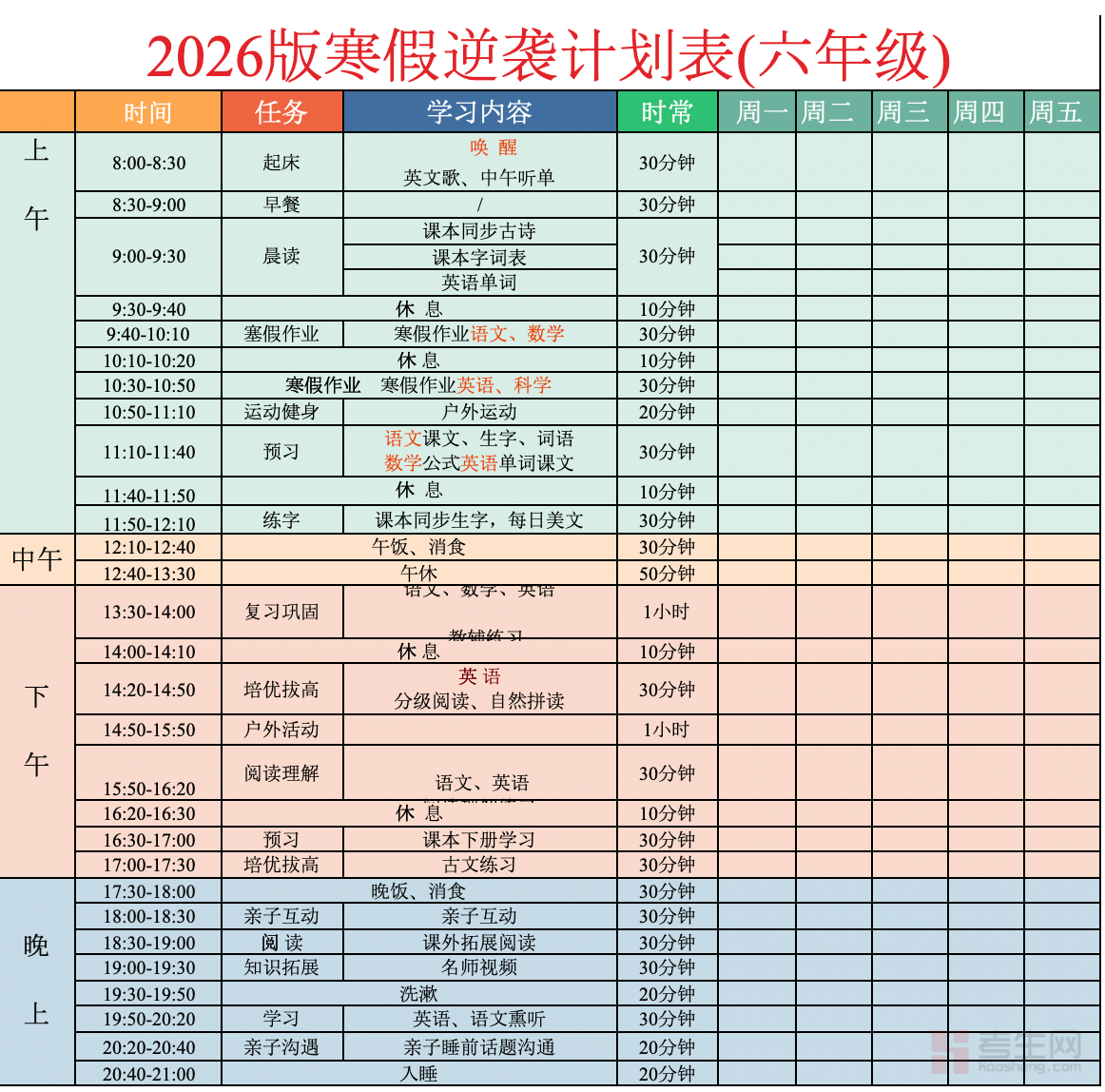 适配六年级学生寒假全科衔接、小升初备考与新学期预习需求,量身打造专属寒假逆袭计划表,科学规划假期学习节奏,兼顾基础复盘与备考拔高,是高效利用寒假、冲刺小升初的实用学习资料。本资料紧扣六年级语文、数学、英语核心重难点,精准衔接秋学期知识漏洞与小升初考点、春学期预习要点,计划表按每日合理拆分学习任务,涵盖基础巩固、错题复盘、考点突破、新知预习等模块,设计科学可落地、可灵活调整。针对性解决假期学习无规划、知识遗忘快、衔接断层及备考无方向等问题,适配居家自主学习、亲子陪伴辅导等场景,助力夯实学科基础,为小升初冲刺和新学期学习抢占先机。