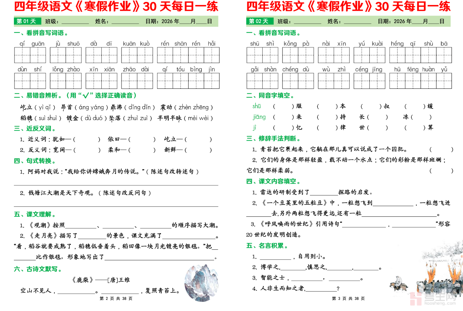 适配四年级学生寒假语文基础巩固、每日打卡与知识衔接需求,打造 30 天系统化语文每日一练资料,科学规划假期每日学习任务,是高效利用寒假夯实语文基础、避免知识遗忘的优质学习资料。本资料紧扣四年级语文核心知识点,贴合教材教学与考法,30 天练习覆盖生字词、古诗文、阅读理解、句式练习、小练笔等全模块,每日定量轻量化练习,难度循序渐进,兼顾基础巩固与能力小幅提升。针对性解决假期语文练习无规划、知识易生疏、读写能力薄弱等问题,适配居家自主打卡、亲子伴学、每日晨练等场景,助力保持语文学习节奏,为新学期衔接筑牢学科基础。