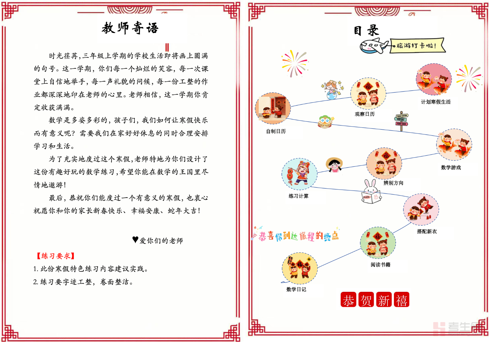 适配三年级学生寒假数学实践运用、知识巩固与思维启蒙需求,打造专属数学特色实践作业,打破传统刷题模式,是假期夯实数学基础、提升实践应用能力的优质学习资料。本资料紧扣三年级数学核心知识点,将抽象的数学知识与生活场景紧密结合,设计趣味动手操作、生活数据调查、简单几何探究等多样实践任务,覆盖数与运算、长方形正方形、质量单位、时间计算等核心模块,任务难度适中、形式生动,兼顾知识巩固与思维拓展。针对性解决数学学习枯燥、知识运用能力弱、实践思维不足等问题,适配居家自主完成、亲子协作探究等场景,助力在实践中理解数学,培养数学应用思维与动手能力,为新学期学习蓄能。