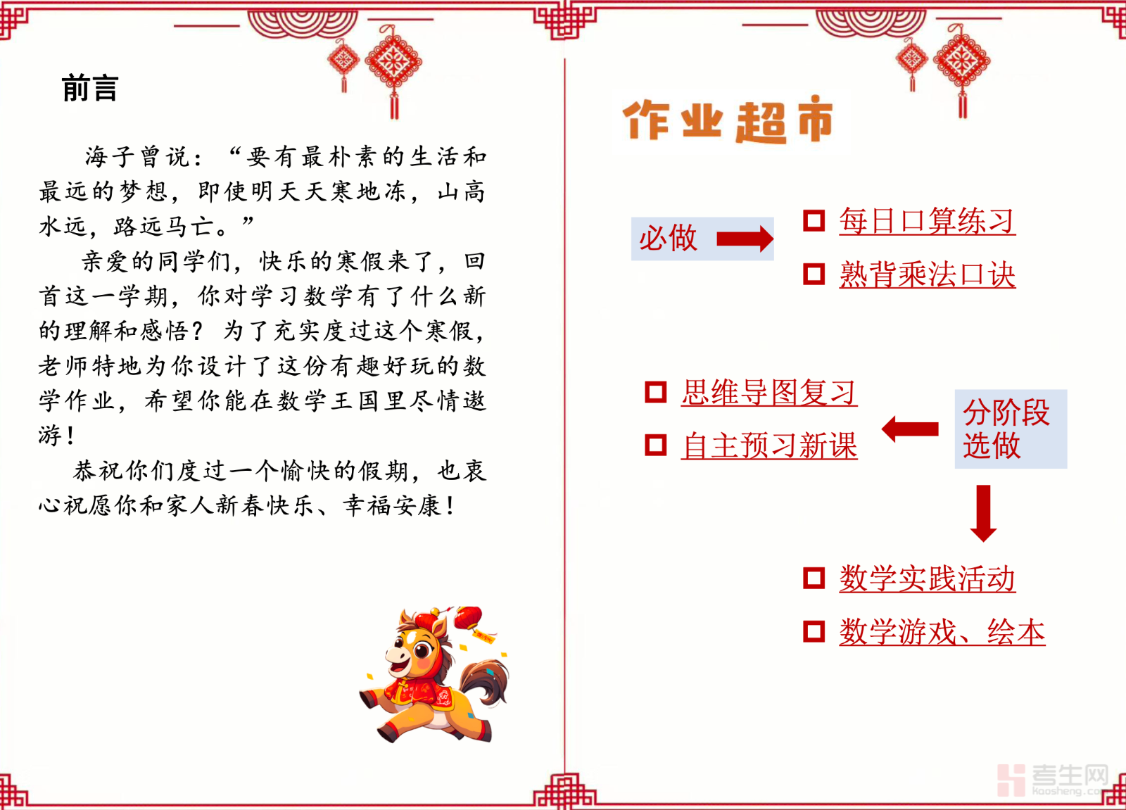 适配二年级学生寒假数学实践运用、知识巩固与思维启蒙需求,打造专属数学特色实践作业,打破传统刷题模式,是假期夯实数学基础、提升实践应用能力的优质学习资料。本资料紧扣二年级数学核心知识点,将抽象的数学知识与日常生活动趣结合,设计动手操作、生活计数、单位认知、图形拼搭等多样实践任务,覆盖表内乘除法、长度单位、角的认识、数据收集等核心模块,任务简单易操作、形式生动,兼顾知识巩固与思维启蒙。针对性解决数学学习枯燥、知识运用能力弱、实践兴趣不足等问题,适配居家自主完成、亲子协作探究等场景,助力在实践中理解数学,培养数学应用思维与动手能力,为新学期学习蓄能。