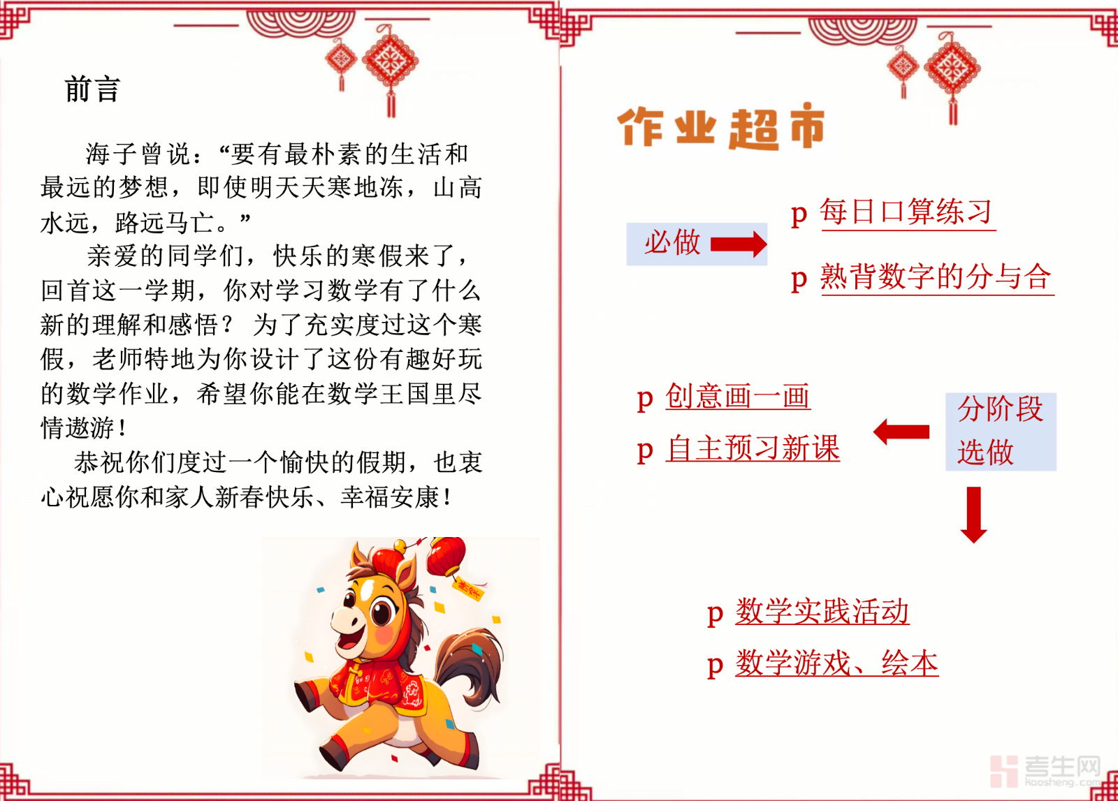 适配一年级学生寒假数学实践启蒙、知识巩固与兴趣培养需求,打造专属数学特色实践作业,打破传统刷题模式,是假期夯实数学入门基础、提升实践应用能力的优质学习资料。本资料紧扣一年级数学核心知识点,将基础的数与运算、图形认知融入趣味生活场景,设计动手拼搭、生活计数、分物操作、图形识别等简单易做的实践任务,覆盖 20 以内加减法、立体图形、人民币认知、分类整理等核心模块,任务低难度、强趣味,兼顾知识巩固与数学思维启蒙。针对性解决数学学习枯燥、知识运用薄弱、实践兴趣不足等问题,适配居家自主完成、亲子协作探究等场景,助力在动手实践中理解数学,培养数学应用意识与动手能力,为新学期数学学习筑牢入门根基。