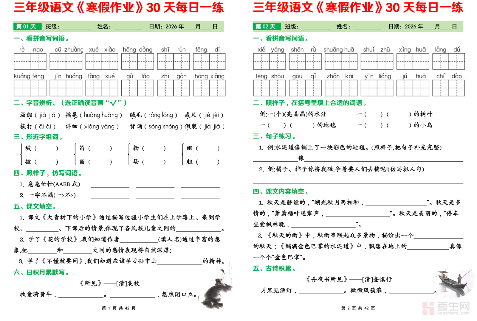 适配三年级学生寒假语文基础巩固、能力进阶与习惯培养需求,打造 30 天系统化语文每日一练资料,科学规划假期每日学习任务,是高效利用寒假夯实语文基础、避免知识遗忘的优质学习资料。本资料紧扣三年级语文教材核心知识点,贴合课内考法设计练习,30 天内容全覆盖生字词书写、古诗文积累、句式变换、片段阅读、小练笔等模块,每日定量轻量化练习,难度循序渐进,兼顾基础巩固与读写能力启蒙。针对性解决假期练习无规划、字词基础不牢、阅读理解薄弱等问题,适配居家自主打卡、亲子伴学、每日晨练等场景,助力保持语文学习节奏,筑牢三年级语文核心知识根基。