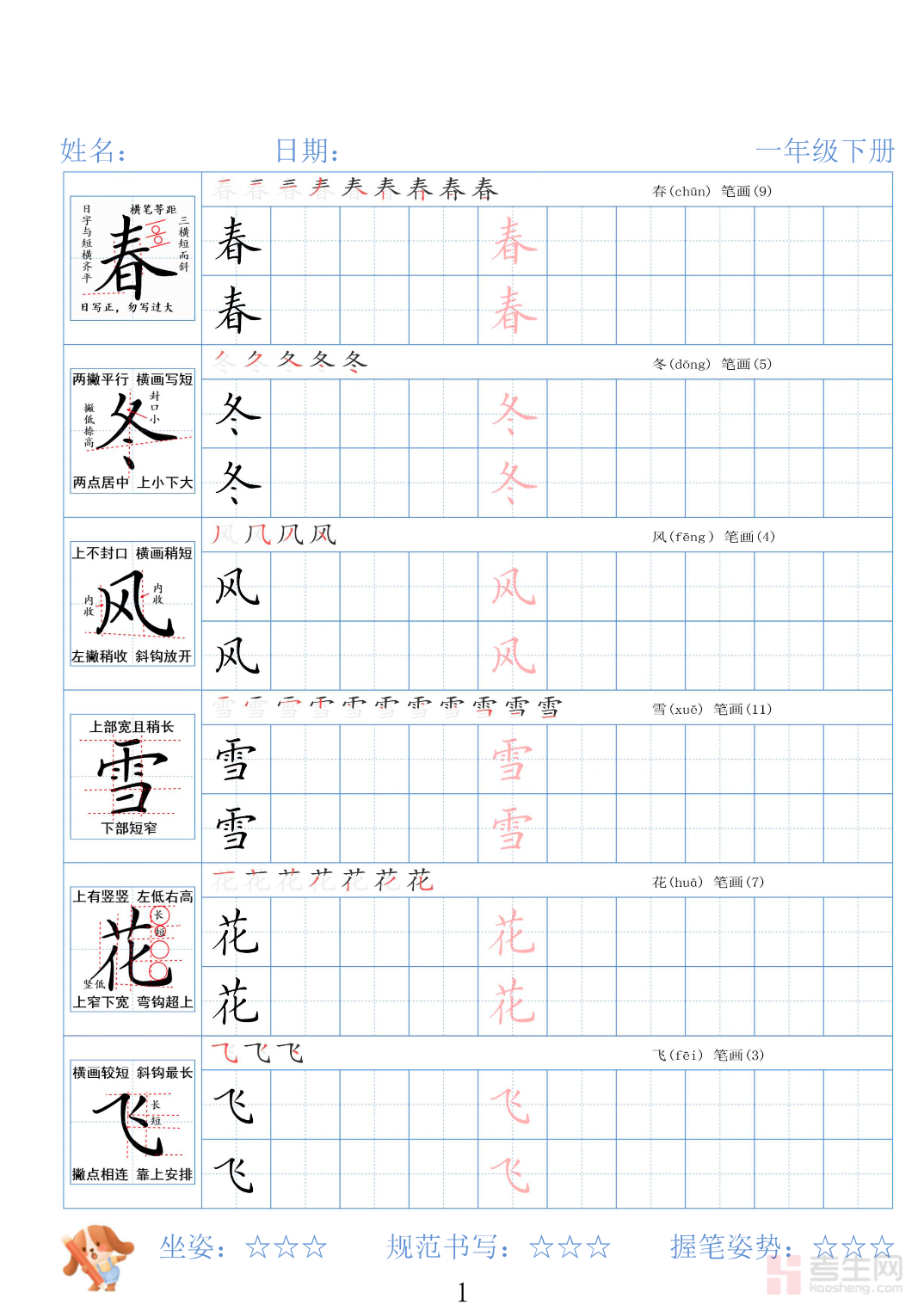 适配 26 年春一年级下册语文同步练字、书写启蒙与识字积累需求,打造贴合新版低段教材的精讲语文字帖,是同步课内学习、夯实书写入门基础、培养良好书写习惯的优质练字资料。本字帖紧扣一年级下册语文教材核心,按单元课时有序编排,全覆盖课本必学生字、基础词语、简单短句及必背儿歌古诗,精准标注拼音、笔顺、易错笔画,针对低年级识字写字重点做通俗书写指引。采用描红 + 临写的科学启蒙设计,笔画难度循序渐进,兼顾书写规范训练与课内识字同步积累,针对性纠正笔顺错误、笔画歪斜等问题,助力练就工整楷书。适配日常课后练字、居家自主练习、课堂同步练字等场景,同步提升书写能力与语文基础积累,筑牢一年级语文书写入门根基。