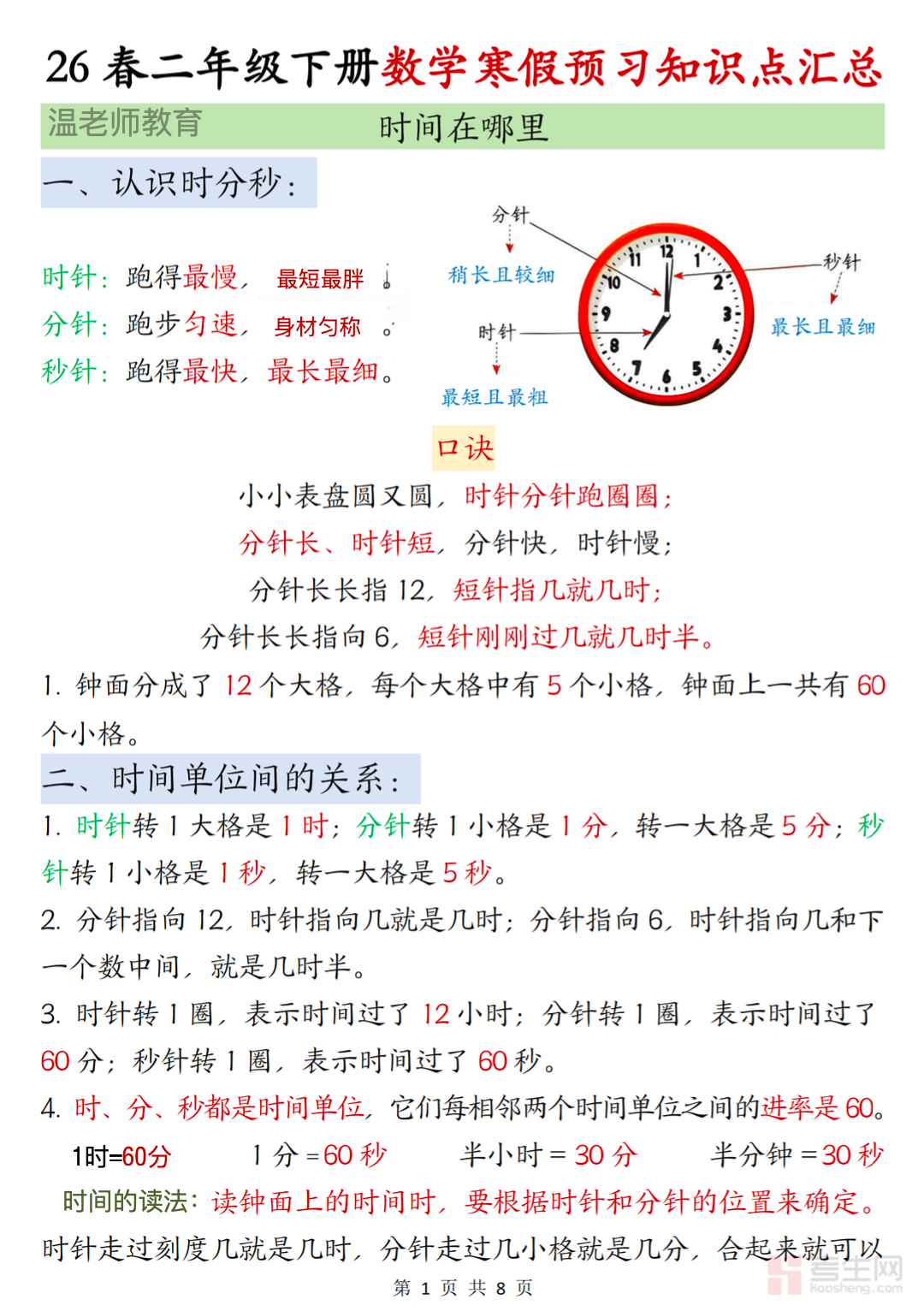 适配二年级学生寒假数学新知预习、基础铺垫与衔接学习需求,打造专属二年级下册数学知识汇总资料,是假期高效梳理新知、筑牢低年级数学学习基础的优质学习资料。本资料紧扣二年级下册数学核心知识点,按教材单元体系科学编排,全覆盖表内除法、万以内数的认识、图形的运动、克与千克、混合运算等核心模块,精准提炼基础概念、计算法则与简单解题方法,同步标注入门易错点和基础考点,搭建易懂的系统化知识框架。内容条理清晰、重难点突出,兼顾预习衔接与基础夯实,针对性解决新知理解模糊、计算不熟练等问题,适配居家自主预习、亲子伴学、假期提前衔接等场景,助力提前掌握核心知识,为新学期数学学习做好充分准备。