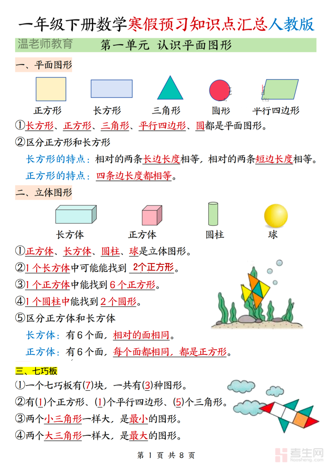 适配一年级学生寒假数学新知预习、基础铺垫与衔接学习需求,打造专属一年级下册数学知识汇总资料,是低年级假期高效衔接新知、筑牢数学入门根基的优质学习资料。本资料紧扣一年级下册数学核心知识点,按教材单元体系科学编排,全覆盖 20 以内退位减法、100 以内数的认识、人民币的认识、100 以内加减法、找规律等核心模块,精准提炼基础概念、计算方法与简单认知要点,同步标注入门易错点和基础考点,搭建浅显易懂的系统化知识框架。内容条理清晰、重难点突出,兼顾预习衔接与基础夯实,针对性解决新知理解模糊、计算不熟练等问题,适配居家自主预习、亲子伴学、假期提前衔接等场景,助力提前掌握核心知识,为新学期数学学习做好充分准备。