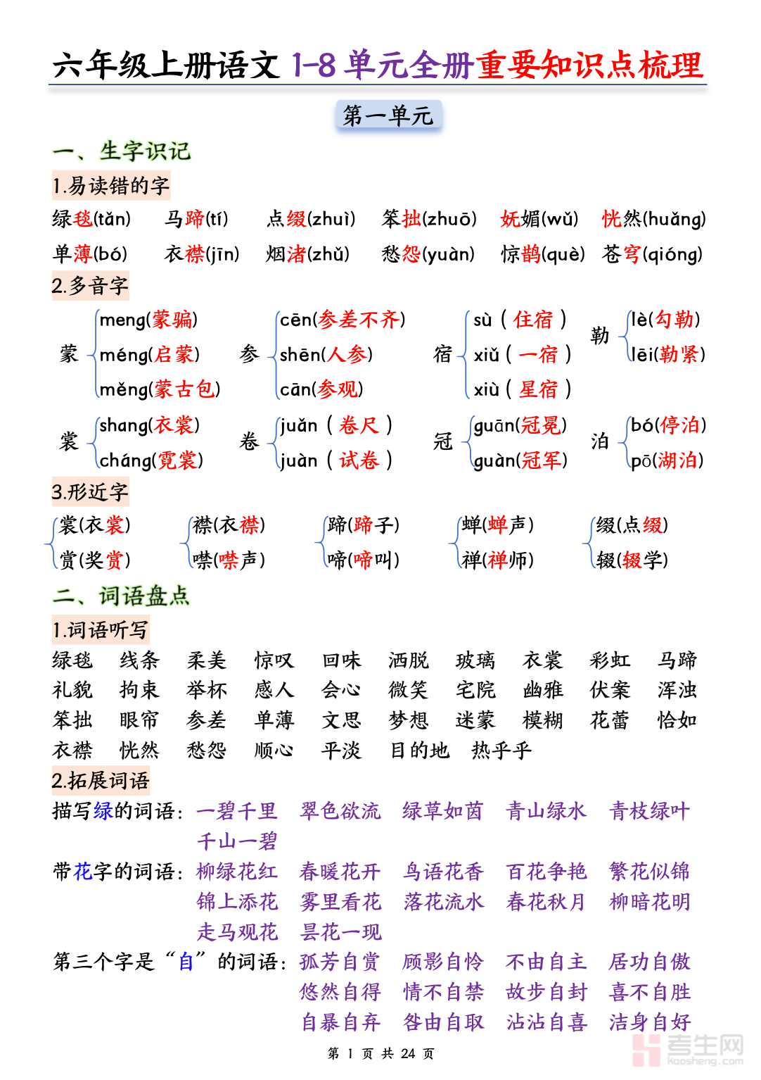 适配六年级学生寒假语文知识梳理、基础巩固与小升初衔接需求,打造专属六年级上册语文知识汇总资料,是假期高效复盘课内知识、夯实语文备考基础的优质学习资料。本资料紧扣六年级上册语文核心知识点,按教材单元体系有序整合,全覆盖生字词积累、古诗文默写、词句运用、阅读理解、习作方法等核心模块,精准提炼重点考点、文体知识与答题技巧,同步标注高频易错点和典型题型解法,搭建系统化知识框架。内容条理清晰、重难点突出,兼顾知识复盘与升学衔接,针对性解决知识零散、读写薄弱、答题不规范等问题,适配居家自主复习、亲子伴学、假期查漏补缺等场景,助力筑牢六年级语文基础,为小升初备考做好衔接。