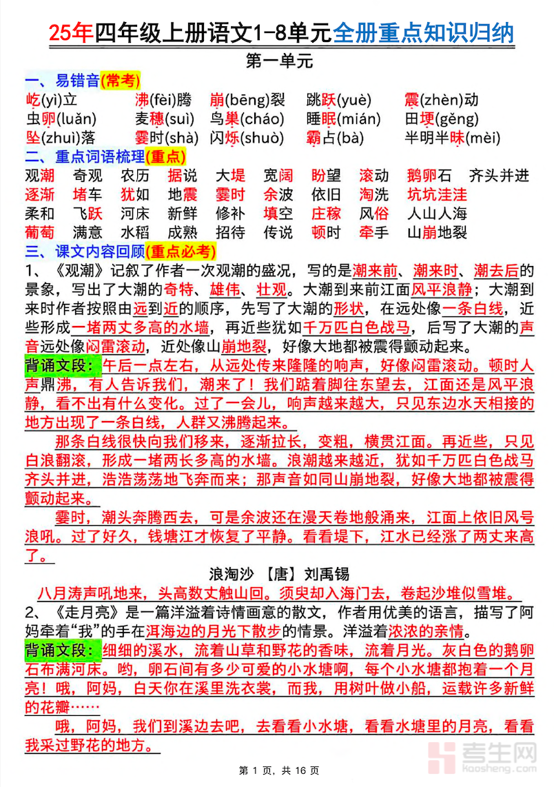 适配四年级学生寒假语文知识梳理、基础巩固与查漏补缺需求,打造专属四年级上册语文知识汇总资料,是假期高效复盘课内知识、夯实语文核心基础的优质学习资料。本资料紧扣四年级上册语文教材核心知识点,按单元体系有序整合,全覆盖生字词积累、古诗文默写、词句运用、阅读理解、习作方法等核心模块,精准提炼重点考点、文体常识与答题技巧,同步标注高频易错点和典型题型解法,搭建系统化知识框架。内容条理清晰、重难点突出,兼顾知识复盘与基础巩固,针对性解决知识零散、读写薄弱、答题不规范等问题,适配居家自主复习、亲子伴学、假期查漏补缺等场景,助力筑牢四年级语文基础,为后续学习做好衔接。