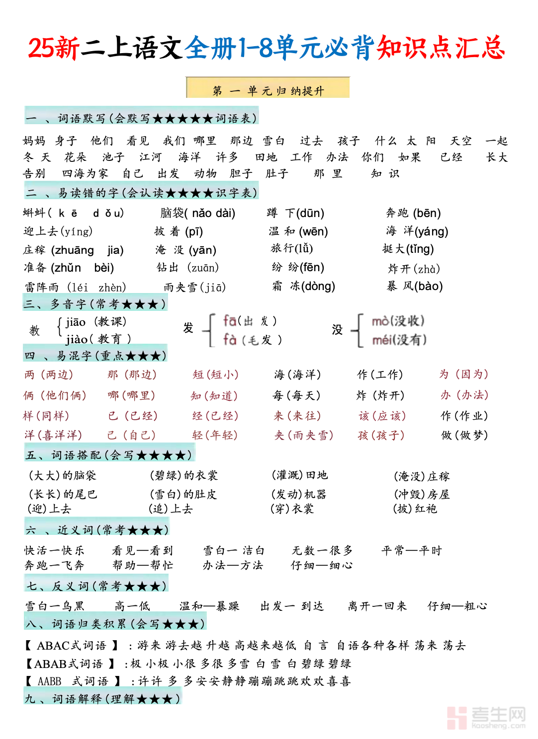 适配二年级学生寒假语文知识梳理、基础巩固与查漏补缺需求,打造专属二年级上册语文知识汇总资料,是低年级假期高效复盘课内知识、夯实语文入门基础的优质学习资料。本资料紧扣二年级上册语文教材核心知识点,按单元体系有序整合,全覆盖生字词认读书写、古诗背诵、词句积累运用、课内语段理解、看图写话基础等核心模块,精准提炼基础要点、书写规范与简单学习方法,同步标注低年级高频易错点,搭建浅显易懂的知识框架。内容条理清晰、贴合低年级认知,兼顾知识复盘与基础巩固,针对性解决知识零散、书写不规范、表达薄弱等问题,适配居家自主复习、亲子伴学、假期查漏补缺等场景,助力筑牢二年级语文基础,为后续学习做好衔接。