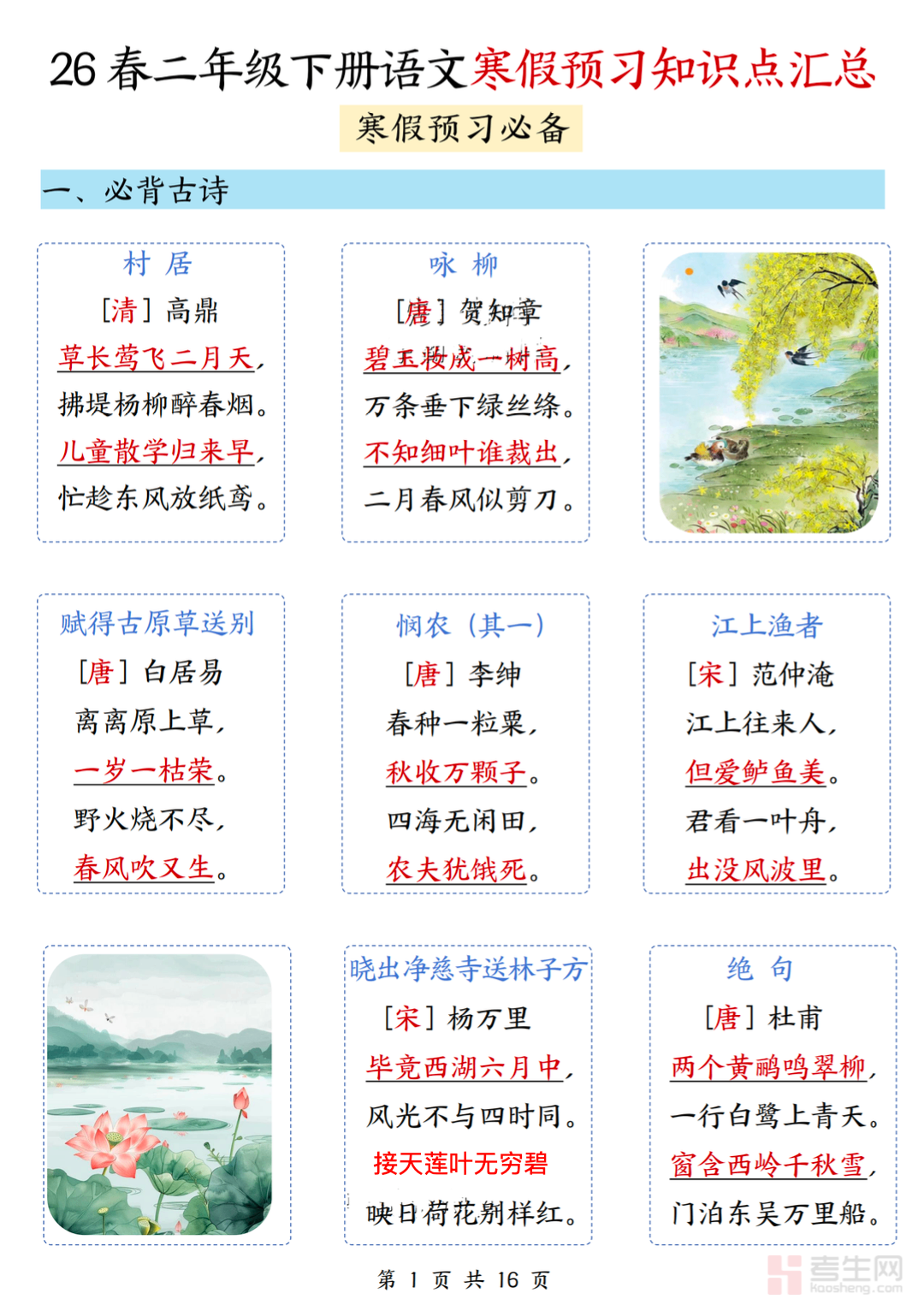 适配二年级学生寒假语文新知预习、知识梳理与基础衔接需求,打造专属二年级下册语文知识汇总资料,是低年级假期高效衔接新学期、夯实语文入门基础的优质学习资料。本资料紧扣二年级下册语文教材核心知识点,按单元体系科学编排,全覆盖生字词认读书写、古诗必背、词句积累运用、语段理解、看图写话进阶技巧等核心模块,精准提炼基础要点、书写规范与简单读写方法,同步标注入门易错点,搭建浅显易懂的知识框架。内容条理清晰、贴合低年级认知,兼顾预习衔接与基础夯实,针对性解决新知理解模糊、书写不规范、表达薄弱等问题,适配居家自主预习、亲子伴学、假期提前衔接等场景,助力提前掌握核心知识,为新学期语文学习做好充分准备。