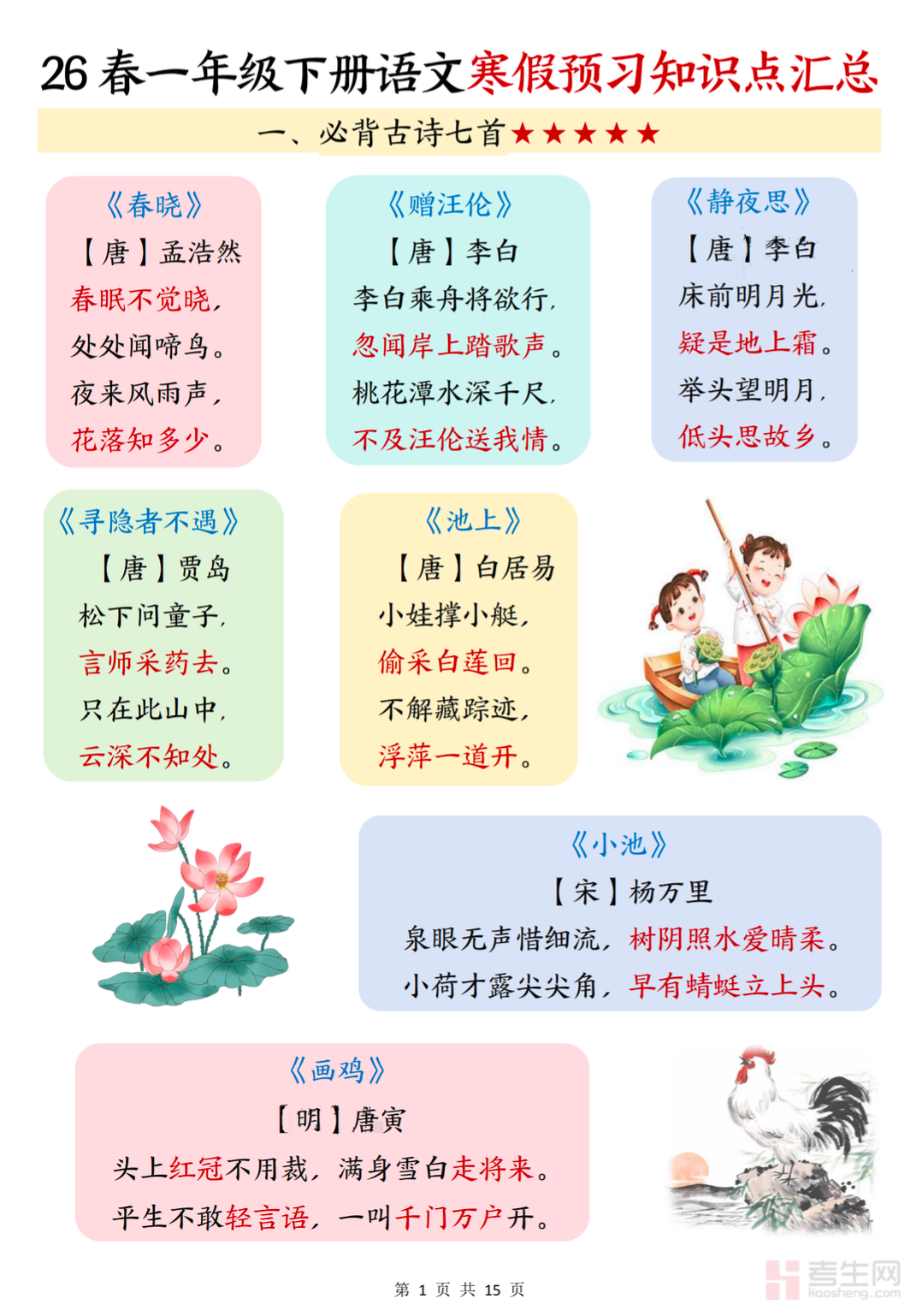 适配一年级学生寒假语文新知预习、基础铺垫与衔接学习需求,打造专属一年级下册语文知识汇总资料,是低段假期高效衔接新学期、夯实语文入门根基的优质学习资料。本资料紧扣一年级下册语文教材核心,按单元体系科学编排,全覆盖生字认读书写、偏旁部首、词语积累运用、古诗必背、看图写话基础进阶等核心模块,精准提炼低段学习要点、书写规范与表达方法,同步标注入门易错点,搭建浅显易懂的知识框架。内容贴合低段认知特点、条理清晰,兼顾预习衔接与基础夯实,针对性解决新知理解模糊、书写不规范、表达薄弱等问题,适配居家自主预习、亲子伴学、假期提前衔接等场景,助力提前掌握核心知识,为新学期语文学习做好充分准备。
