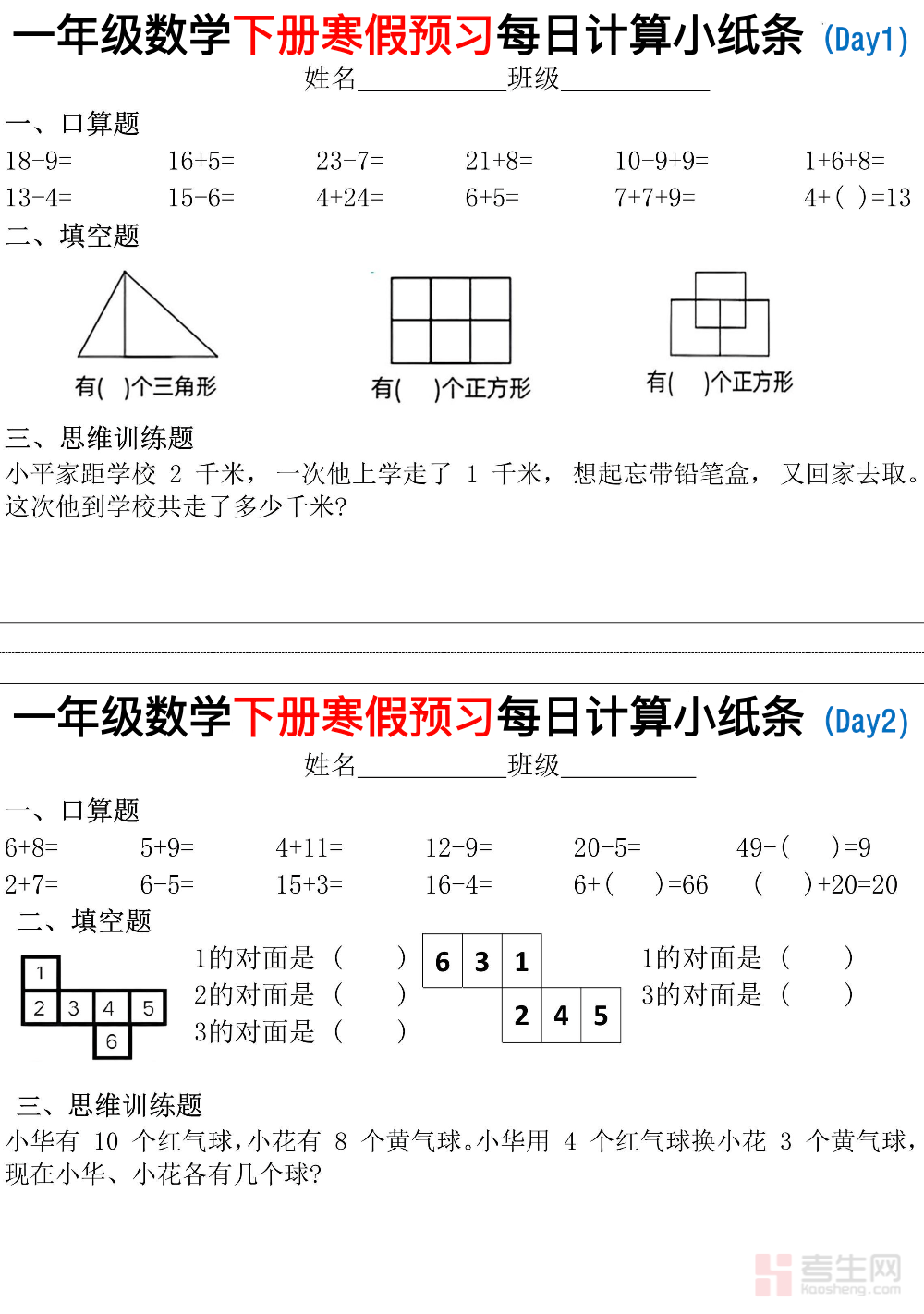 适配一年级学生寒假数学每日打卡、基础巩固与计算提升需求,打造贴合低年级认知的寒假数学每日练习资料,是假期高效夯实数学入门基础、培养每日学习习惯的优质练习素材。本资料紧扣一年级数学核心知识点,按寒假时长科学规划每日练习内容,覆盖 20 以内加减法、100 以内数的认识、简单应用题、图形认知等基础模块,每日练习量适中、题型基础经典,精准贴合课堂所学重点,同步针对低年级计算易错点设计专项练习。内容编排循序渐进、难度适中,贴合一年级学生学习节奏,兼顾基础巩固与习惯培养,针对性解决计算不熟练、知识运用薄弱等问题,适配居家每日打卡、亲子伴学练习等场景,助力孩子在假期稳步提升数学能力,筑牢入门基础。