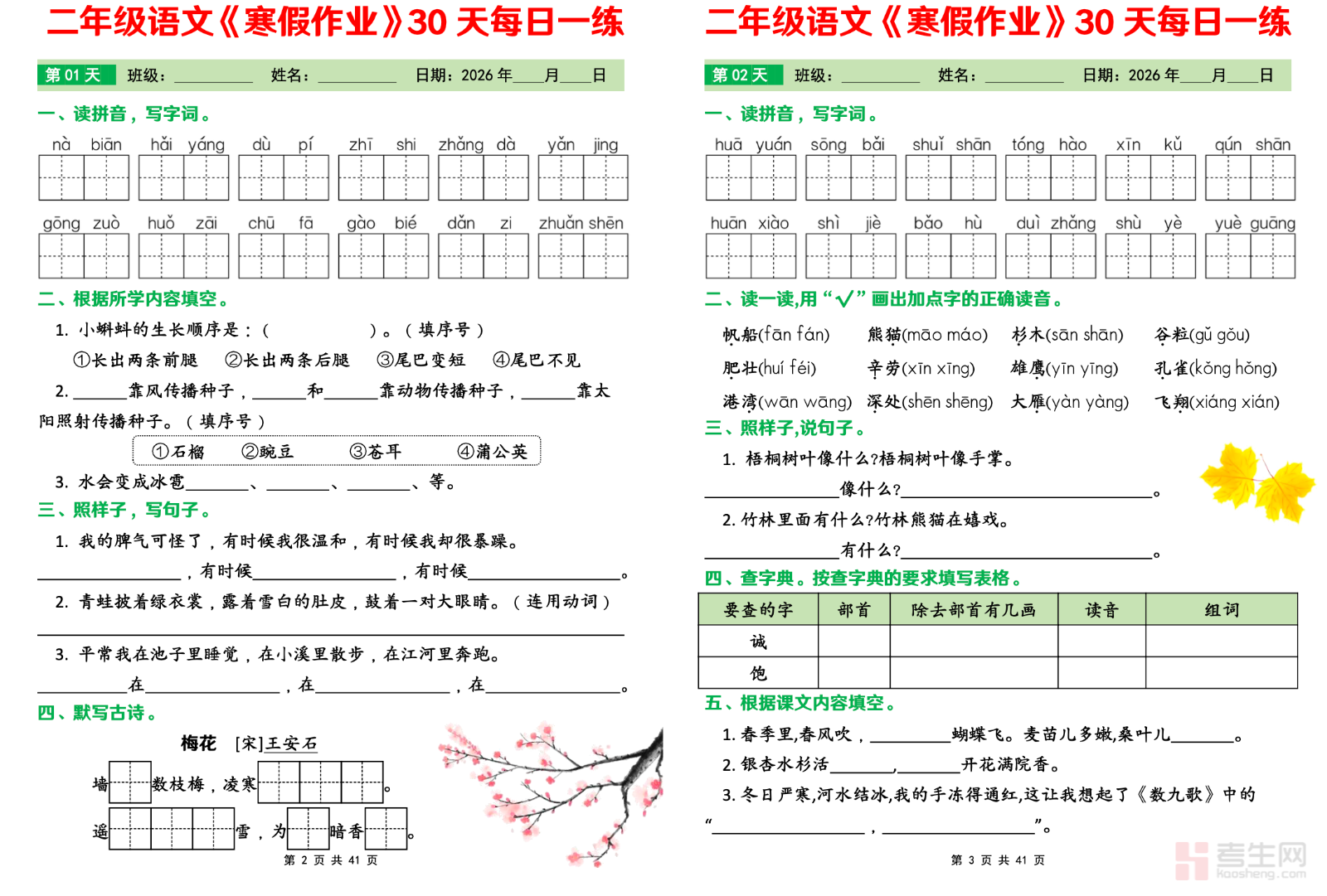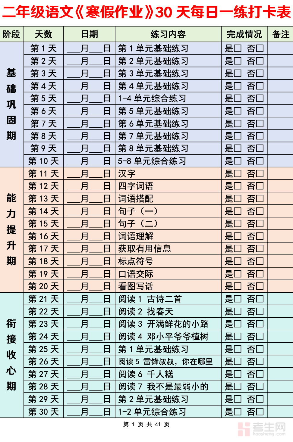 适配二年级学生寒假语文每日打卡、基础巩固与能力提升需求,打造贴合低年级认知的寒假语文每日练习资料,是假期稳步积累语文知识、培养每日学习习惯的优质练习素材。本资料紧扣二年级语文核心知识点,按寒假时长科学规划每日练习内容,覆盖生字词认读书写、偏旁笔顺、词语搭配、古诗默写、语段理解、看图写话基础等模块,每日练习量适中、题型经典贴合课堂,针对低年级书写不规范、词句运用薄弱等易错点设计专项练习。内容编排循序渐进、难度适配,兼顾基础巩固与习惯培养,适配居家每日打卡、亲子伴学练习等场景,助力孩子在假期稳步夯实语文基础,提升读写表达能力。