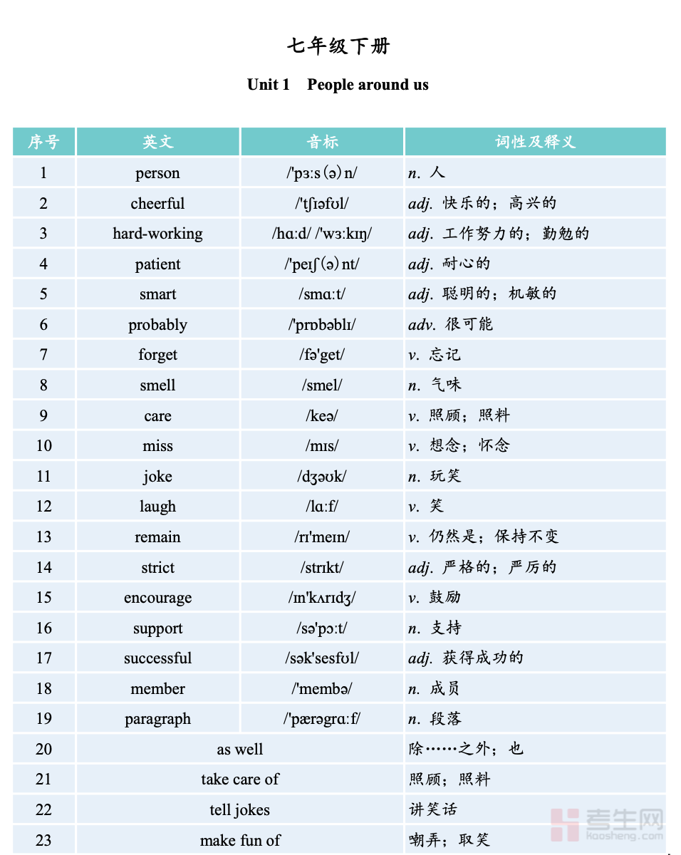 适配七年级下册学生英语同步学习、单词记背与基础巩固需求,是贴合初一下册学习节奏的专属英语单词资料,助力学子衔接课内知识,稳步夯实英语词汇基础。本单词表紧扣七年级下册英语教材核心,全面收录课本各单元必背单词,精准标注音标、核心释义、词性及课本经典搭配,高频词汇补充简单用法拓展,贴合初一学生的认知水平。内容严格按教材单元有序编排,条理清晰、重点明确,针对性解决单词记背无条理、发音不标准、运用不熟练等问题,适配日常同步记背、课后复习、单元检测及考前突击,助力高效积累课内词汇,提升英语基础运用能力。