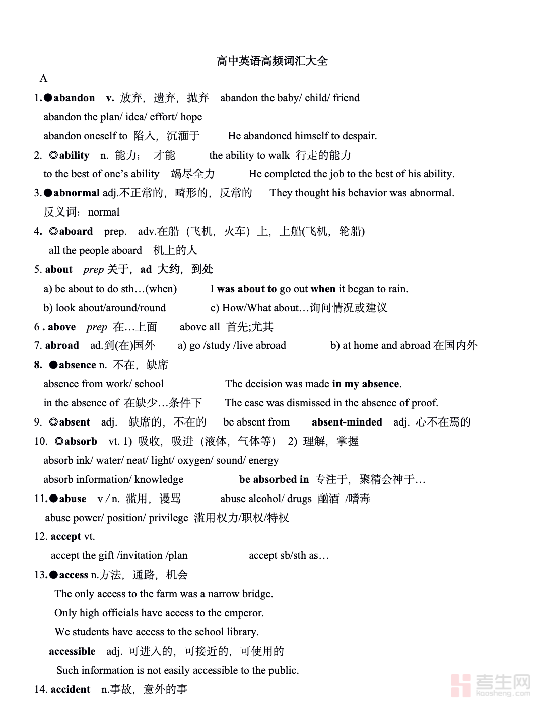 适配高中生英语学习、词汇积累及高考备考需求,是专为高中阶段打造的英语词汇核心资料,助力学子精准攻克高频词汇,夯实英语学习基础。本资料紧扣高中英语课标与高考考纲,从历年真题及课内重点中梳理提炼全学段高频词汇,全面标注音标、核心释义、词性、常考搭配及经典例句,部分词汇补充派生词与易混词辨析,兼顾基础识记与考场运用。内容按字母顺序有序编排,条理清晰、查阅便捷,针对性解决词汇记背无重点、易遗忘、运用不熟练等问题,适配高一高二同步积累、高三备考冲刺及日常刷题速查,助力构建系统的词汇体系,提升阅读、写作等各题型解题能力。