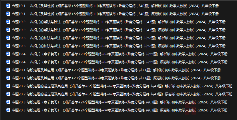 本文档含14个专题文档,分解析版与原卷版,适配人教版2024八年级下册数学。1-7为原卷版:知识荟萃原卷(覆盖二次根式、勾股定理等全章核心