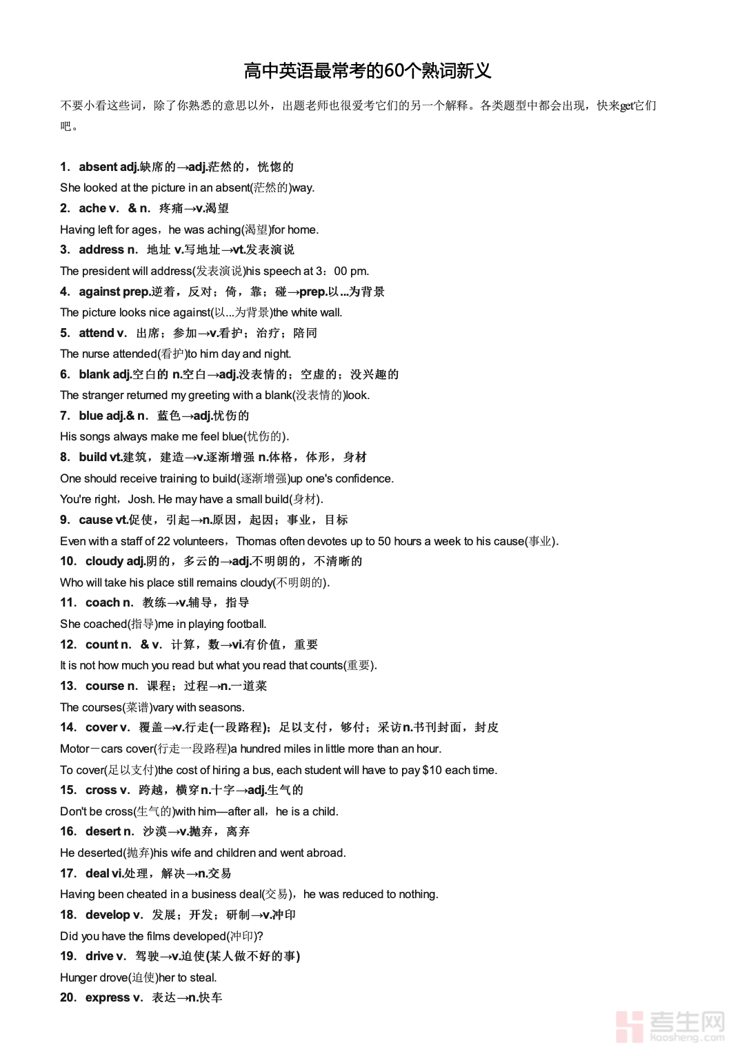 适配高中生英语备考、阅读完形提分需求,是专为高考英语高频考点打造的实用词汇资料,助力突破熟词新义失分难点。本资料紧扣高考英语真题与考纲,精选 60 个最常考、最易出错的熟词新义,清晰标注单词常见含义与真题中的特殊用法,搭配真题例句与场景解析,帮助学生快速理解、精准记忆。内容重点突出、直击考点,针对性解决单词认识却看不懂句子、完形阅读误判语义等问题,适配日常积累、刷题查漏、考前突击复习,有效提升阅读理解与完形填空正确率,为高考英语提分助力。