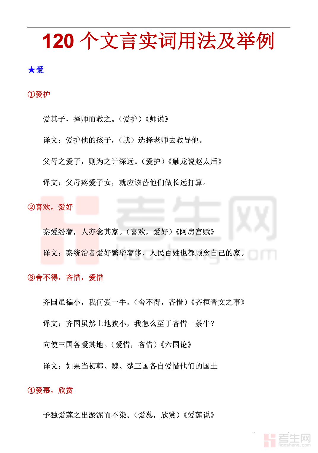 适配初高中学生文言文学习、实词积累与考试提分需求,是专为文言实词专项突破打造的核心学习资料,助力夯实文言文基础,提升阅读翻译能力。本资料系统整理120 个中高考必考文言实词,详细梳理每个实词的常见义项、用法特点,搭配课本经典例句与真题例句,释义准确、举例典型,方便理解记忆。内容按规律编排,重点突出、条理清晰,针对性解决实词词义记不全、语境判断不准、翻译失分等问题。适合日常积累、文言文专项训练、考前突击使用,帮助学生快速掌握核心实词,从容应对文言文阅读、翻译及各类题型。