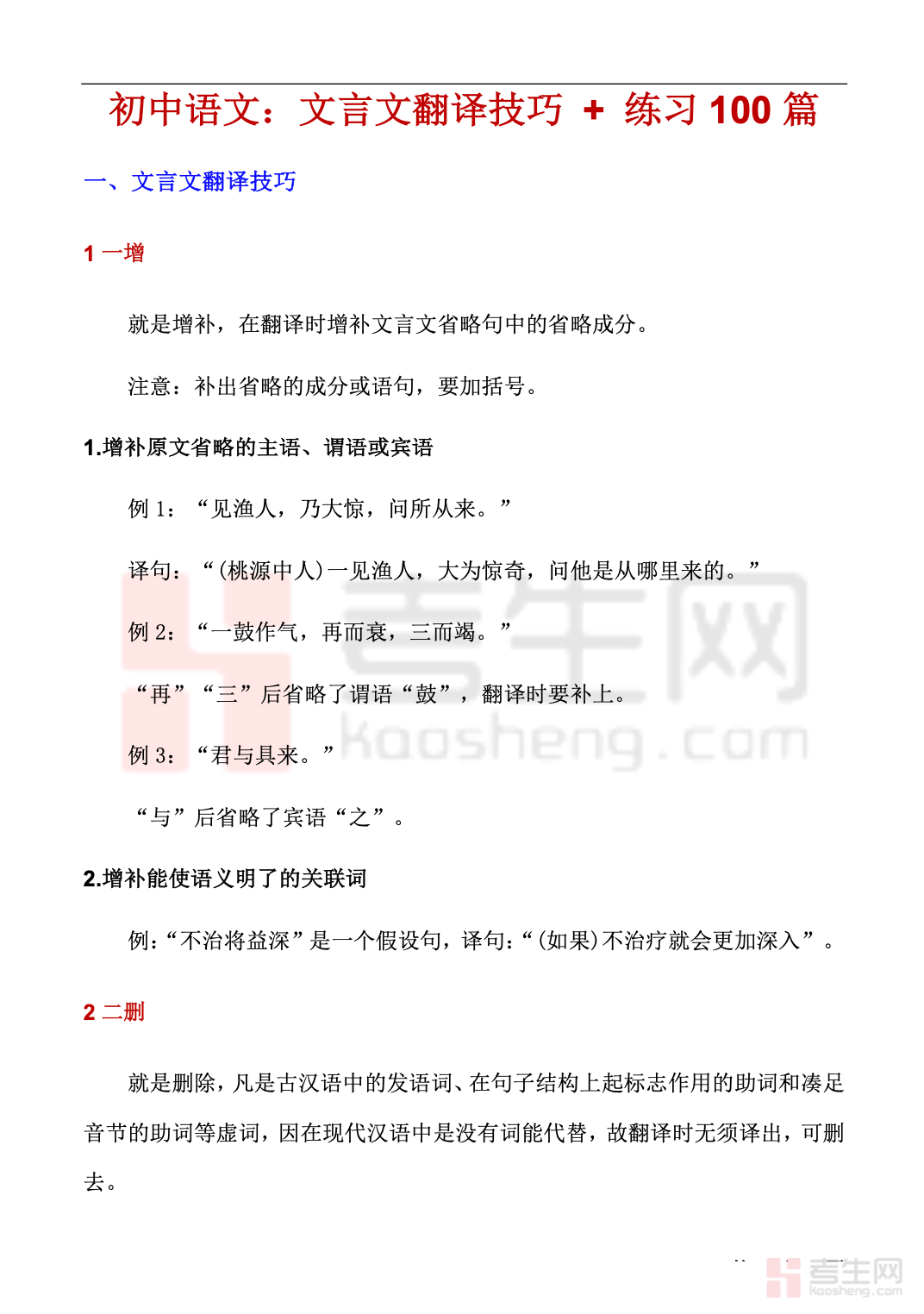 适配初中学生文言文翻译提升、中考备考需求,是一套技巧与练习结合的专项学习资料,助力攻克文言文翻译难点。本资料先系统讲解实用翻译方法,如留、换、删、补、调等技巧,搭配典型例句示范,让学生掌握规范翻译思路。同时精选 100 篇贴合中考难度的文言文练习,涵盖课内重点与课外经典篇目,每篇均附逐句精准翻译、重点字词注释和详细解析。内容由浅入深、学练结合,针对性解决翻译不通、字词不准、失分严重等问题。适合日常训练、考前突击使用,帮助学生快速提高文言文翻译与阅读理解能力。
