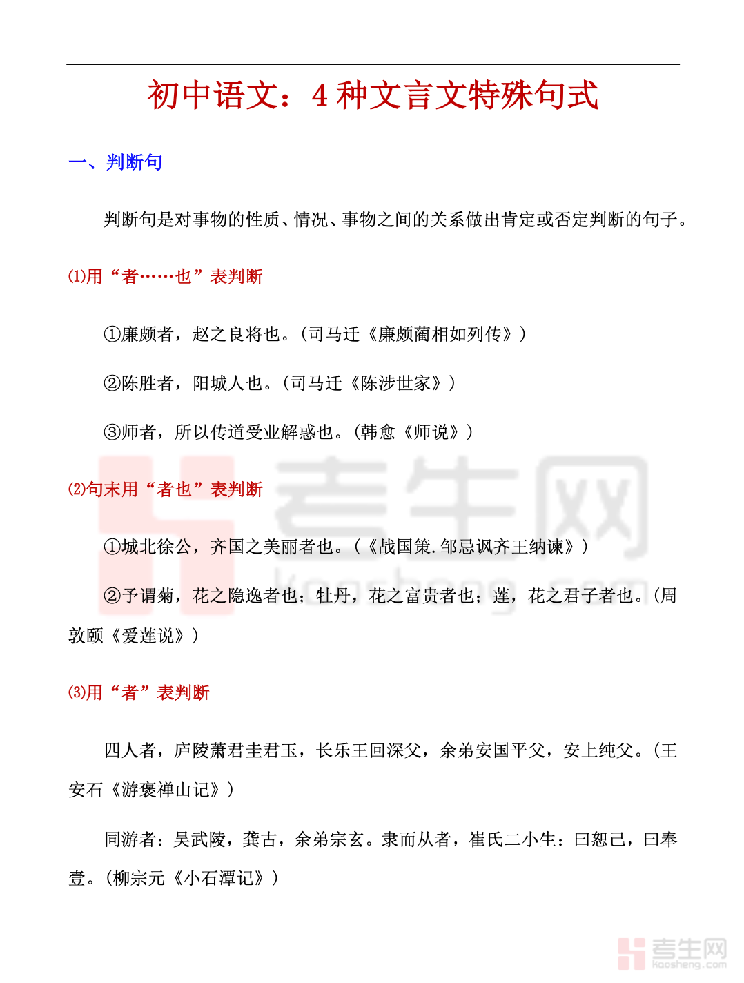适配初中学生文言文学习、翻译与答题提分需求,是专为突破文言句式难点打造的专项资料。本资料聚焦中考必考的判断句、被动句、倒装句、省略句4 种核心特殊句式,清晰讲解每种句式的标志、结构特点与判断方法,搭配课本经典例句与翻译解析,直观易懂。内容条理分明、重点突出,针对性解决句式判断不准、翻译不通顺、阅读理解失分等问题。适合日常学习、专项梳理、考前复习使用,帮助学生快速掌握文言特殊句式规律,提升文言文翻译与解题能力,轻松应对考试各类题型。