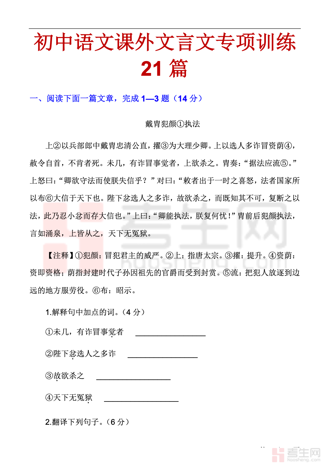 适配初中学生文言文阅读提升、中考备考需求,是专为课外文言训练打造的精简实用资料。本资料精选 21 篇贴合中考难度的经典课外文言文,题材涵盖寓言、人物、历史、哲理等,题型包含字词理解、句子翻译、内容概括、主旨分析等,同步配套详细答案与解析。每篇均附重点字词注释、全文翻译和答题思路,由浅入深、针对性强,有效解决课外文言读不懂、翻译不准、答题没方法等问题。适合日常练习、查漏补缺、考前突击使用,帮助学生稳步提升文言文阅读与应试能力。