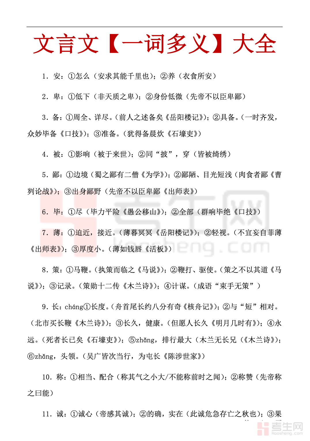 适配初中各年级学生文言文学习、字词巩固与中考备考需求,是专为一词多义专项整理的核心资料。本资料全面汇总课内高频文言实词、虚词的多种含义与用法,按字词分类梳理,清晰对比不同义项,搭配课文经典例句与语境解析,方便理解记忆。内容紧扣中考文言文考点,重点突出、条理清晰,针对性解决词义混淆、判断失误、翻译不准、阅读失分等问题。适合日常积累、专项梳理、考前复习使用,帮助学生扎实掌握一词多义规律,提升文言文翻译、理解与应试答题能力。