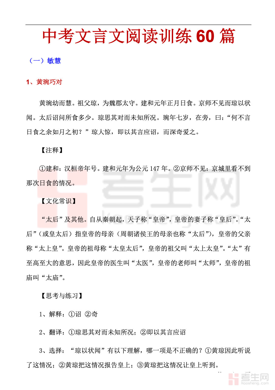 适配初中各年级学生文言文专项提升与中考备考需求,是一套系统全面的阅读训练资料。本资料精选 60 篇贴合中考命题难度与方向的课外文言文,题材涵盖人物传记、寓言故事、历史典故、哲理短文等,题型规范完整,覆盖字词解释、句子翻译、内容理解、人物分析、主旨概括等高频考点。每篇均配重点字词注释、全文翻译、练习题及详细答案解析,由浅入深、学练结合。内容紧扣中考考纲,针对性解决文言读不懂、翻译不精准、答题踩分不全等问题,适合日常训练、查漏补缺、考前集中复习使用,帮助学生稳步提升文言文阅读能力与应试得分水平。