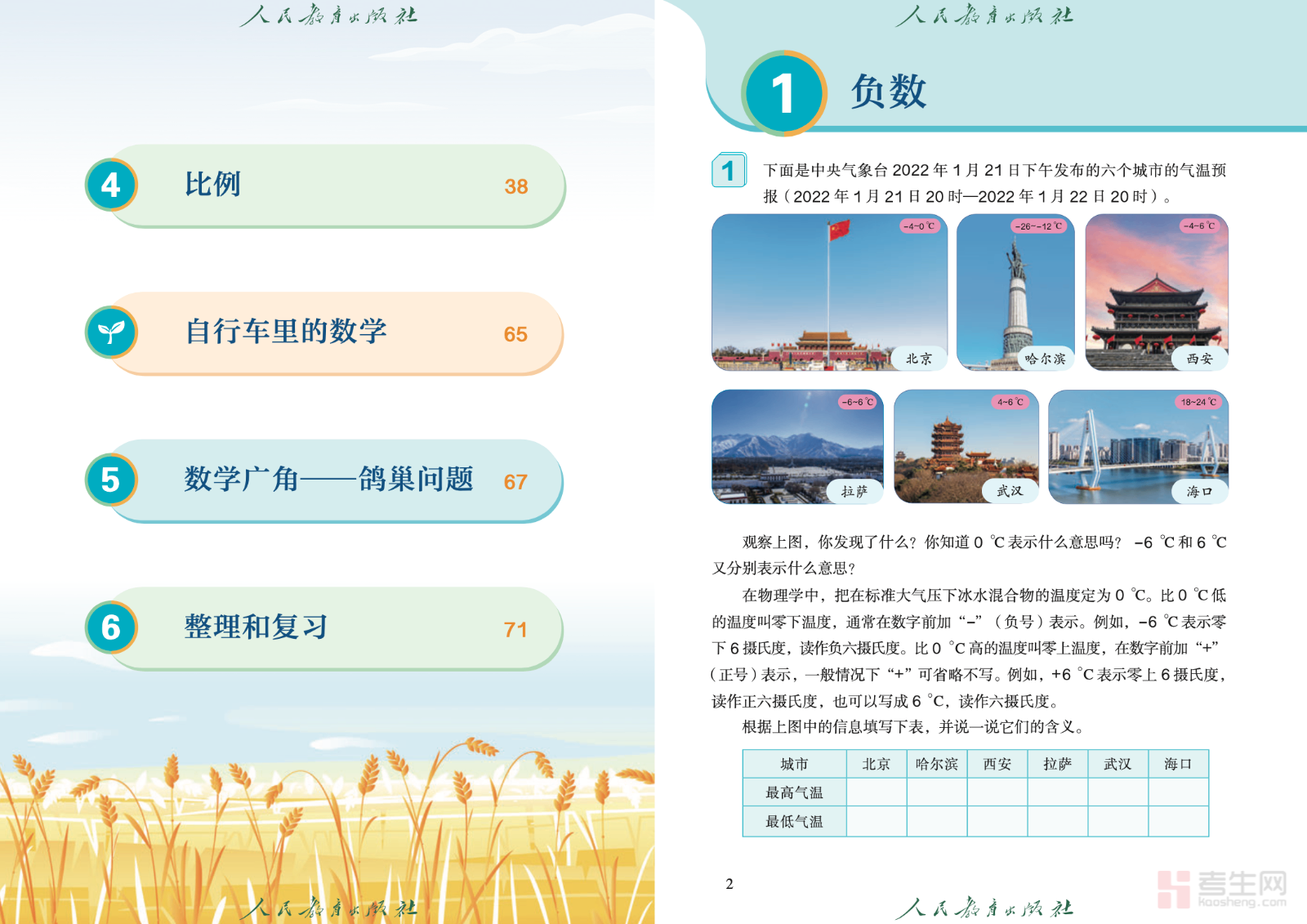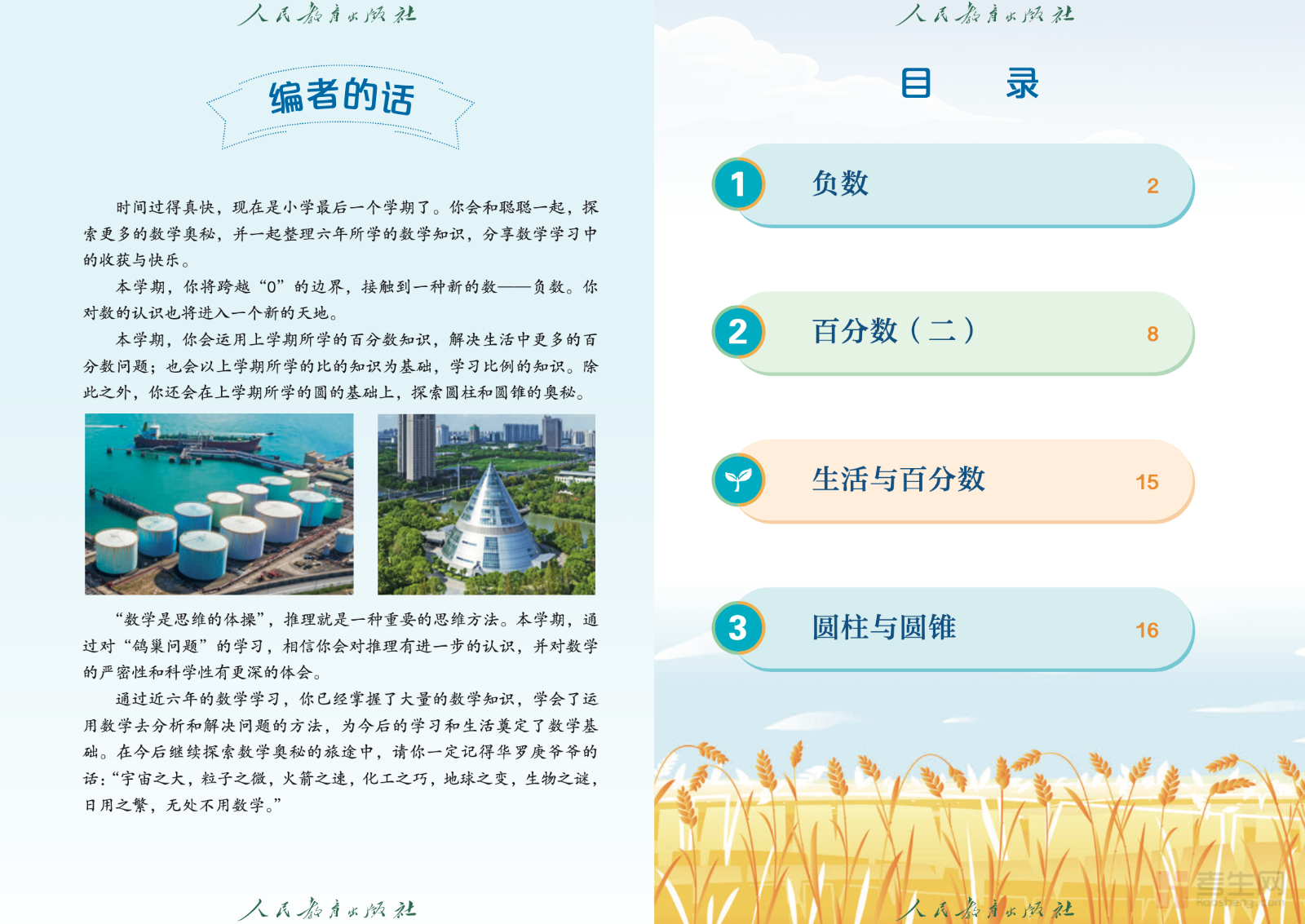 本书是依据国家课程标准编写的人教版六年级下册数学教材,贴合小学六年级学生的学习节奏与认知特点,系统呈现本册核心内容。全书围绕负数、百分数(二)、圆柱与圆锥、比例、整理和复习等重点知识展开,结构清晰、图文并茂,注重知识理解与实际应用相结合。教材由浅入深、循序渐进,既重视基础运算与概念掌握,也强化逻辑思维、空间想象和解决实际问题的能力。内容规范严谨,适合课堂教学、课前预习及课后复习使用,帮助学生扎实完成小学阶段数学学习,为初中数学学习奠定扎实基础。