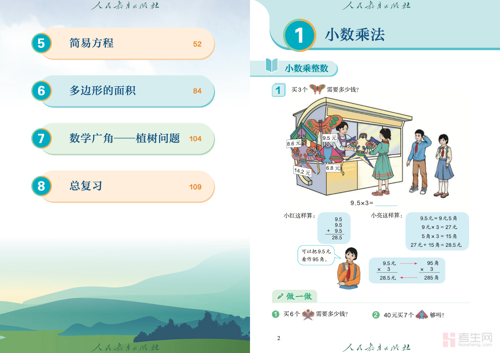 本书是依据国家课程标准编写的人教版五年级上册数学教材,贴合小学五年级学生的认知水平与学习节奏,系统讲解本册核心知识点。内容涵盖小数乘法、小数除法、位置、多边形的面积、可能性、简易方程等重点模块,结构清晰、图文结合,注重知识理解与生活应用相结合。教材由浅入深、循序渐进,兼顾基础知识学习与思维能力培养,帮助学生掌握运算方法、提升逻辑思维与解决实际问题的能力。内容规范科学,适合课堂教学、课前预习及课后复习,助力学生扎实打好小学数学基础,稳步提升数学素养。