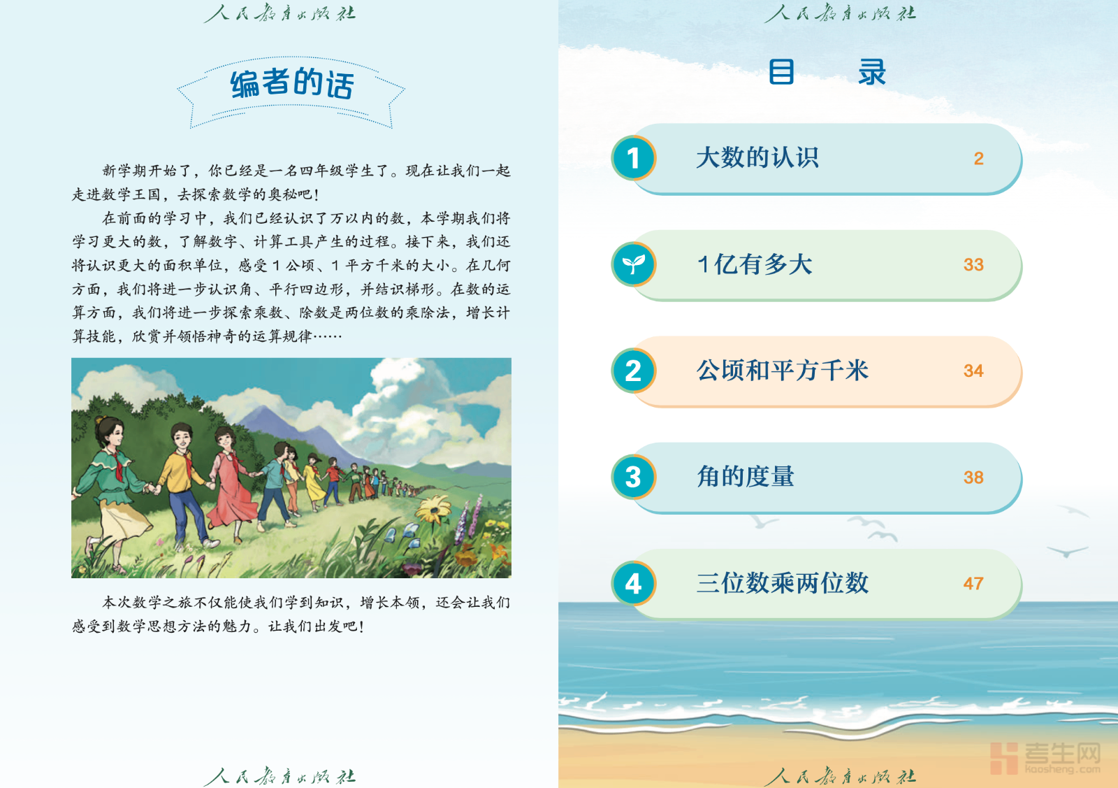 本书是依据国家课程标准编写的人教版四年级上册数学教材,贴合小学四年级学生的认知特点与学习节奏,系统讲解本册核心知识点。内容涵盖大数的认识、角的度量、三位数乘两位数、平行四边形和梯形、条形统计图等重点模块,结构清晰、图文结合,注重基础理解与实际运用。教材由浅入深、循序渐进,兼顾计算能力、空间观念与逻辑思维的培养,帮助学生扎实掌握数学知识。内容规范严谨,适合课堂教学、课前预习及课后复习,助力学生稳步提升数学素养,为后续学习打下坚实基础。