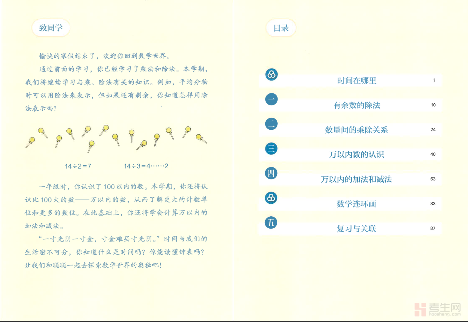 本书是依据国家课程标准编写的人教版二年级下册数学教材,贴合小学低年级学生的认知规律与学习特点,内容生动易懂、图文并茂。全书围绕表内除法、有余数的除法、万以内数的认识、克和千克、图形的运动、混合运算等重点知识展开,难度循序渐进,注重基础知识与生活实际相结合。教材设计贴近小学生学习习惯,便于理解和掌握,既能用于课堂教学,也适合学生自主预习、课后复习,帮助孩子夯实数学基础,培养初步的计算能力、逻辑思维与学习兴趣,为后续数学学习做好铺垫。