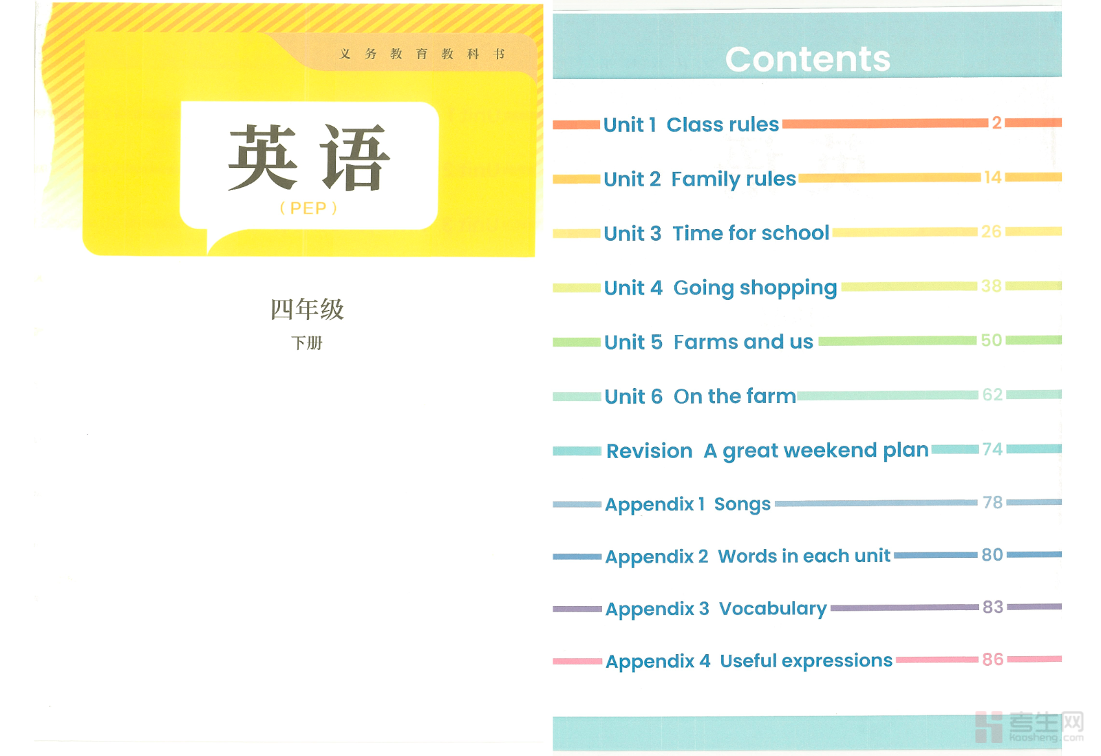 本书是依据国家义务教育英语课程标准编写的小学四年级下册官方教材,采用人教 PEP 版体系,贴合四年级学生的认知特点与英语学习节奏。教材围绕校园生活、天气季节、衣物服饰、农场动物、购物等贴近学生日常的主题展开,设置多个学习单元与复习单元,系统学习基础词汇、常用句型、简单对话与交际用语。内容搭配听力、对话、朗读、书写练习、趣味歌谣等多种形式,注重听说读写全面训练,语言浅显易懂、情境生动实用,便于课堂教学与课后巩固。全书循序渐进、重点明确,帮助学生夯实英语基础,培养英语学习兴趣与初步语言运用能力。