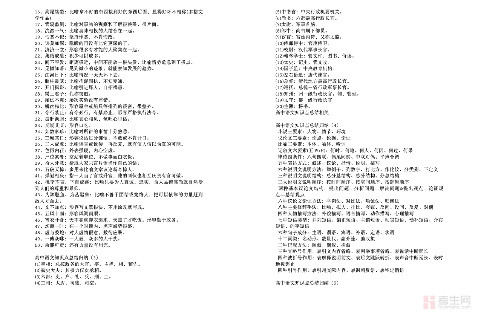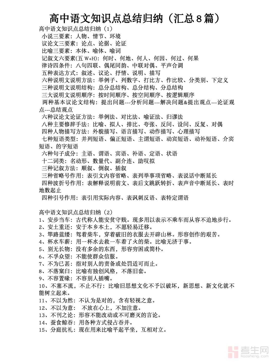 本文档是针对高中语文全面整理的知识点汇总,覆盖文言文、古诗词、现代文阅读、作文素材、语法修辞、文学常识等核心内容。资料按模块系统梳理,重点突出、条理清晰,将零散知识归纳成完整体系,方便学生理解、记忆与查阅。适用于高一至高三日常学习、单元复习及考前冲刺,可帮助学生夯实语文基础,提升阅读分析、古诗文理解与写作表达能力。内容实用易懂、针对性强,是高中语文学习和备考的优质辅助资料,助力稳步提高语文成绩。