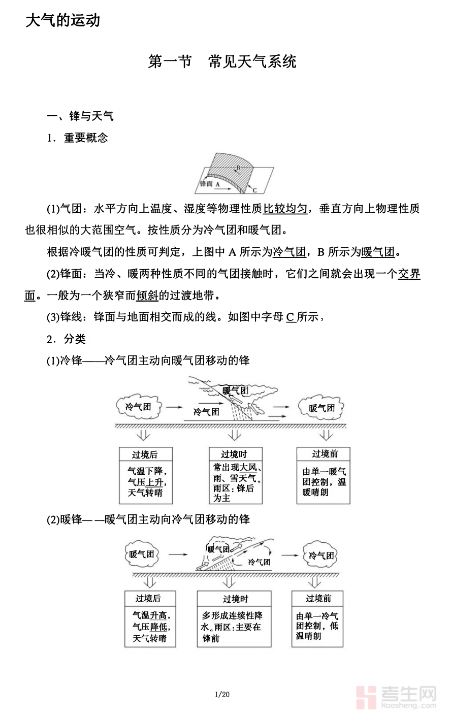 本文档聚焦高中地理核心模块 —— 大气的运动,系统梳理该章节全部知识点,涵盖热力环流、大气水平运动(风)、气压带和风带、常见天气系统等核心内容。紧扣教材重点与高考高频考点,摒弃冗余内容,重点突出、条理清晰,详细解读原理、规律及易混易错点,辅助学生理解记忆。内容贴合高中地理学习节奏,兼顾同步学习、单元复习与考前专项突破,可帮助学生理清知识逻辑、夯实专项基础,提升读图分析与原理应用能力,是高中地理大气运动模块学习与备考的实用专项资料。