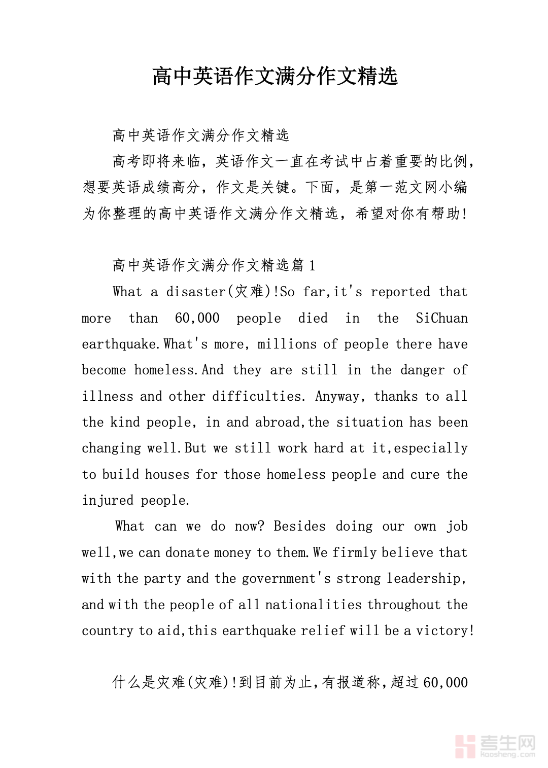 本文档是专为高中学生整理的英语满分作文资料,精选各类考场高分范文,覆盖书信、通知、议论文、记叙文、看图写作等高考常考题型,贴合高中英语写作要求与评分标准。每篇范文结构清晰、句式规范、用词地道,包含亮点句型、衔接词汇与经典表达,方便学生直接借鉴模仿。资料重点突出实用性,兼顾审题思路、段落布局和写作技巧,可快速提升文章逻辑性与文采。适合高中各年级日常练习、考前突击、作文提分使用,帮助学生掌握高分写作套路,积累优质素材,轻松写出规范、流畅、高分的英语作文。