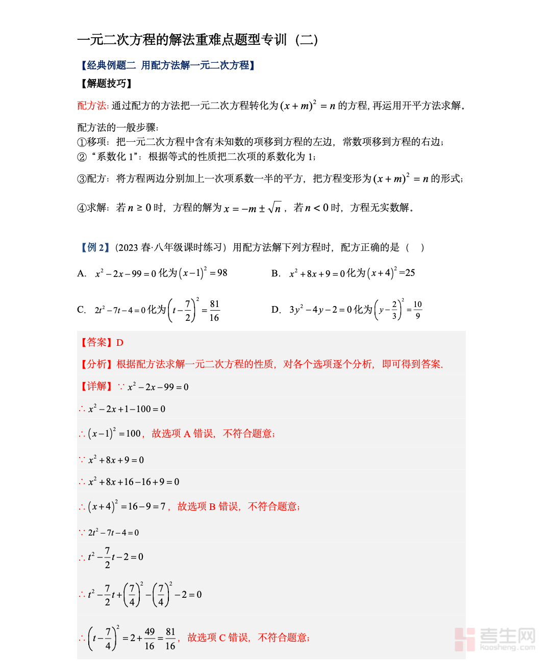 本文档是适配九年级一元二次方程学习的专项训练资料,严格依据教材重点与考试要求编撰,聚焦一元二次方程解法的重难点题型,全面覆盖直接开平方法、配方法、公式法、因式分解法等核心解法的对应题型。资料提炼各类解法的解题关键、步骤要点及易错易混点,搭配典型例题与针对性训练,摒弃冗余内容,条理清晰、重点突出,兼顾基础巩固与题型突破。适配九年级同步练习、单元复习及考前专项攻坚,助力学生吃透解法技巧,熟练应对各类重难点题型,夯实数学基础,提升解题准确率与应试能力,是九年级一元二次方程学习的必备实用资料。