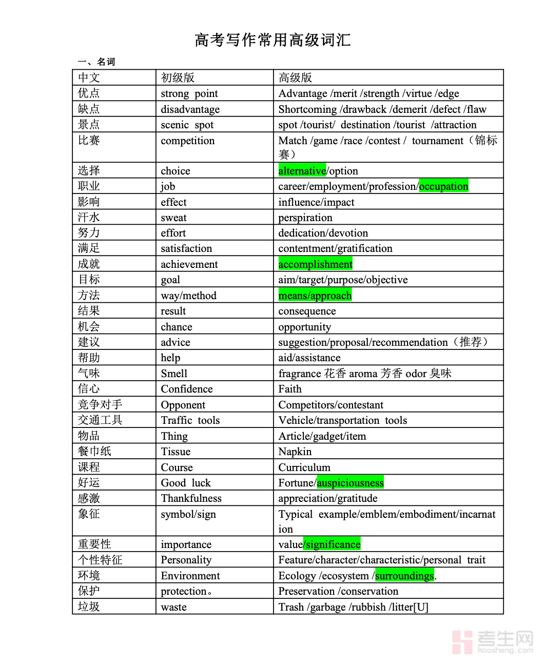 本文档是适配高考英语写作备考的核心词汇资料,严格依据最新考纲及高考写作命题趋势编撰,精选写作高频使用的高级词汇,全面覆盖记叙文、议论文、应用文等主流写作体裁,聚焦替换基础词汇、提升表达质感的核心用法。资料提炼词汇搭配规则、适用场景、同义替换拓展及写作运用技巧,摒弃冗余内容,条理清晰、重点突出,兼顾词汇识记与实战应用。贴合高考英语核心素养考查导向,适配高一高二积累、高三系统冲刺及考前突击,助力学生丰富写作语料,摆脱表达单一,提升作文语言档次与得分,是高考英语写作备考的必备实用资料。