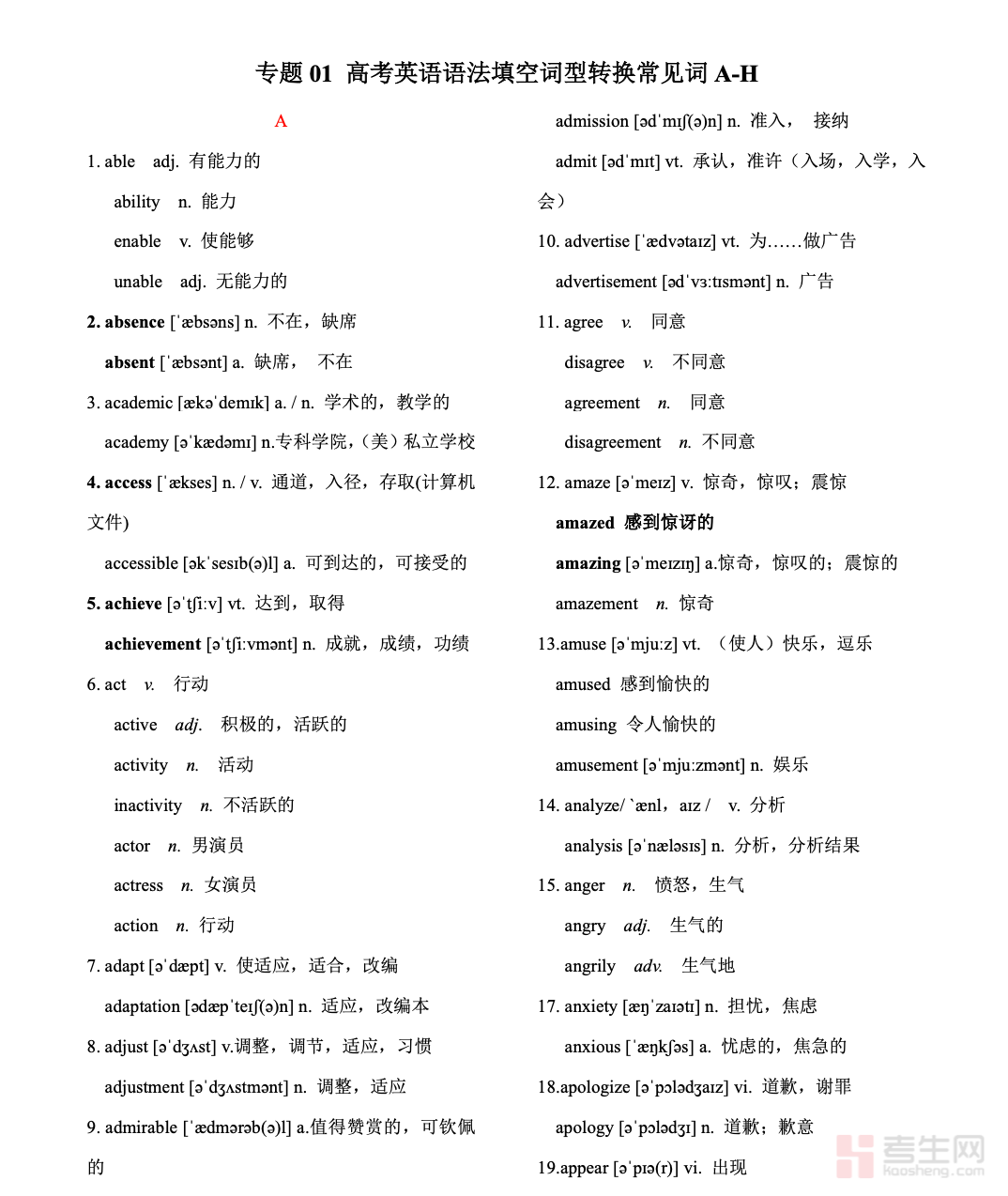 本文档是适配高考英语语法填空备考的核心词形转换资料,严格依据最新考纲及高考命题规律编撰,聚焦 A-H 首字母常见词,全面覆盖语法填空高频考词的词性转换规则、变形形式、用法要点及考场常见考法。资料提炼各词转换核心规律、易错变形辨析、语境应用技巧,摒弃冗余内容,条理清晰、重点突出,兼顾基础识记与实战应用。贴合高考英语考查要求,适配高一高二积累、高三系统冲刺及考前突击巩固,助力学生吃透词形转换考点,提升语法填空解题准确率,是高考英语语法填空备考的实用专项资料。