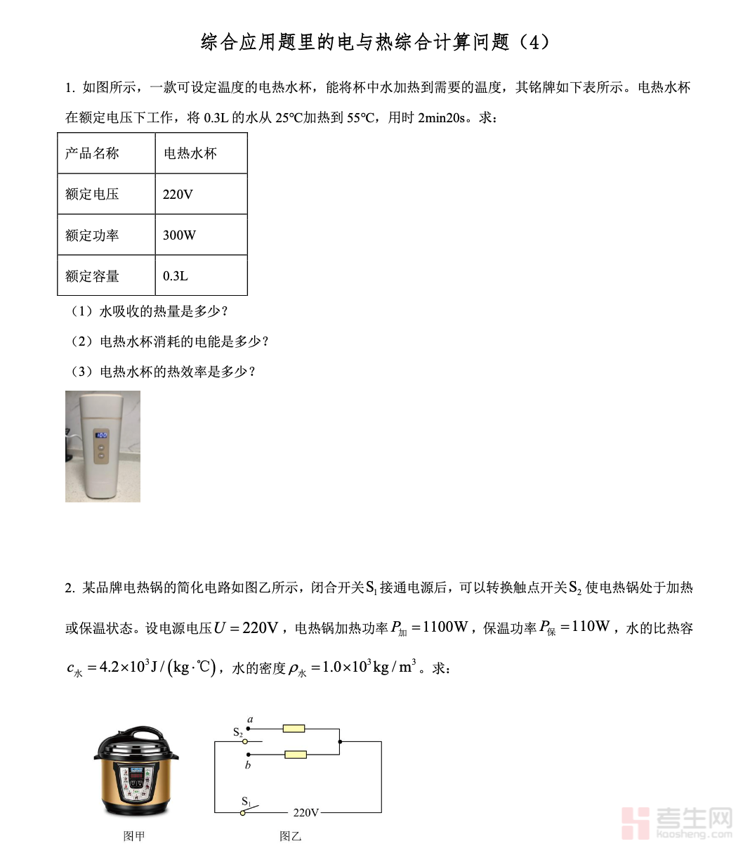 本文档是适配初三物理备考的电与热综合计算专项资料,紧扣中考考纲与教材重点,聚焦综合应用题中的电与热综合计算核心考点,全面覆盖电路分析、电功电热公式应用、串并联电路中电与热的综合求解、实际电路节能与效率计算等高频题型。资料提炼解题关键步骤、公式选用技巧、电路分析方法及易错易混点,搭配典型例题与解题思路,条理清晰、重点突出,兼顾基础巩固与题型突破。适配初三同步复习、专题攻坚及考前突击,助力学生吃透解题逻辑,熟练应对各类电与热综合计算问题,提升解题准确率与应试能力,是初三物理电与热专题备考的实用资料。