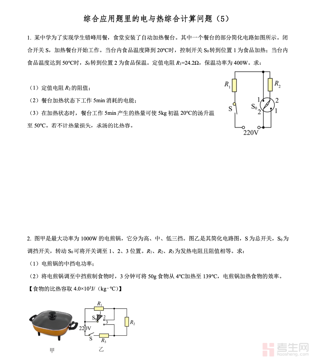 本文档是适配初三物理备考的电与热综合计算专项资料,紧扣中考考纲与教材重点,聚焦综合应用题中的电与热综合计算核心考点,全面覆盖电路分析、电功电热公式应用、串并联电路中电与热的综合求解、实际电路节能与效率计算等高频题型。资料提炼解题关键步骤、公式选用技巧、电路分析方法及易错易混点,搭配典型例题与解题思路,条理清晰、重点突出,兼顾基础巩固与题型突破。适配初三同步复习、专题攻坚及考前突击,助力学生吃透解题逻辑,熟练应对各类电与热综合计算问题,提升解题准确率与应试能力,是初三物理电与热专题备考的实用资料。