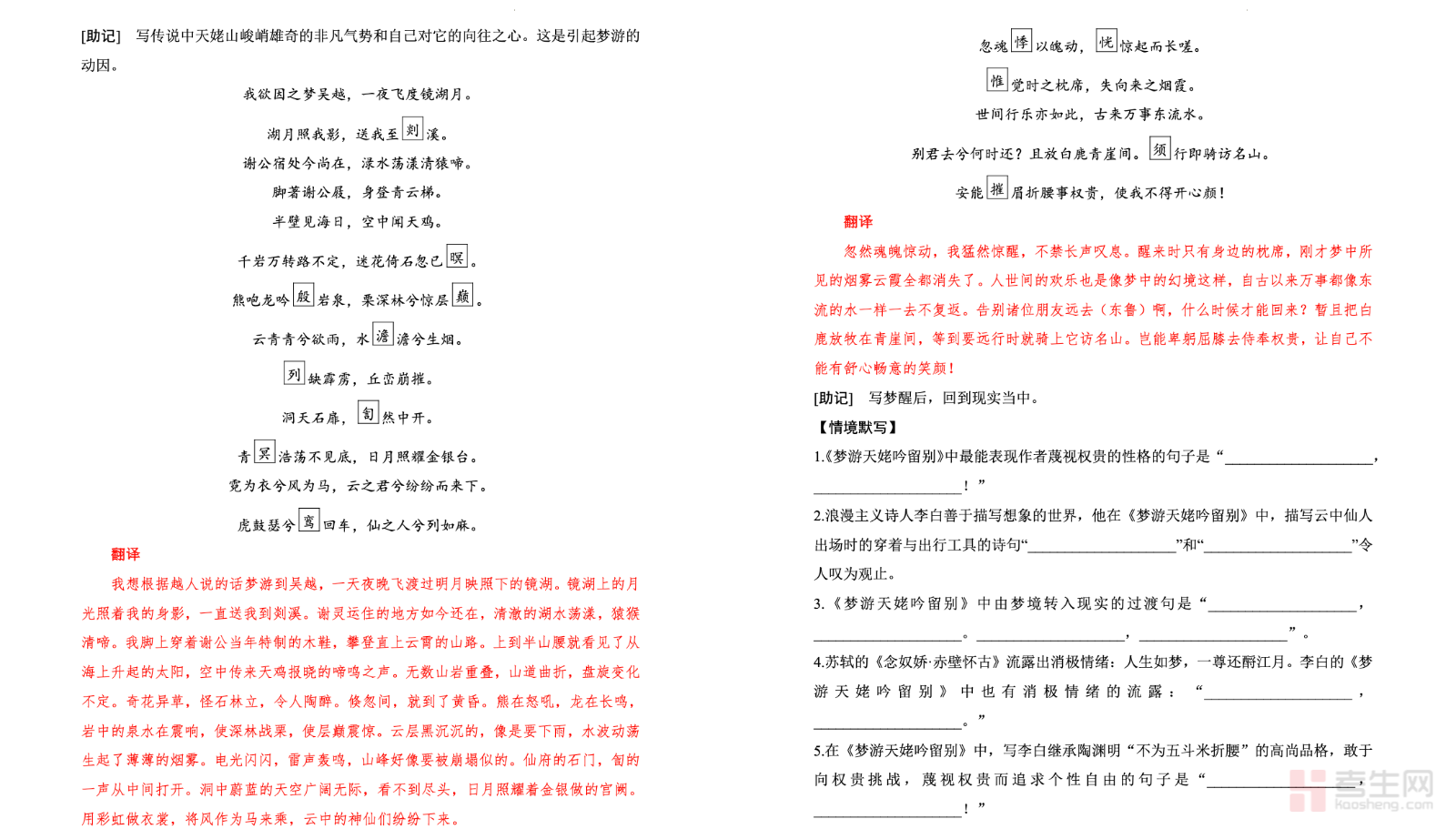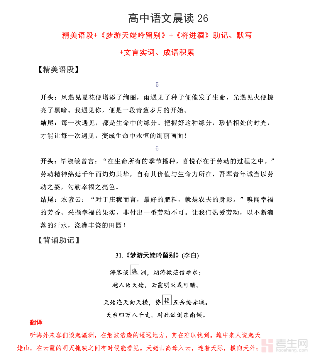 本文档是适配新高中语文课标要求的古诗文晨读专项资料,聚焦 60 篇必背篇目里的《梦游天姥吟留别》《将进酒》两大经典,融合古诗文核心知识与热点主题语段积累,打造高效激情晨读内容。资料梳理篇目文言实词、虚词、句式等核心考点,提炼主旨内涵、名句赏析与答题要点,同时结合高考热点主题搭建语段素材,实现知识识记与素材积累双提升。内容条理清晰、重点突出,兼顾基础夯实与应试应用,适配高中各年级晨读积累、古诗文专题复习及写作素材储备,助力学生吃透经典篇目,积累优质语段,提升古诗文素养与语文应试能力。