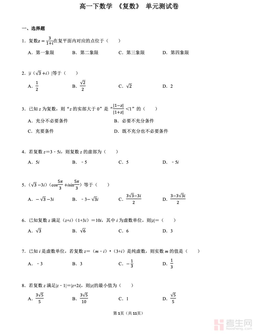 本文档是适配高一下数学《复数》单元的专项测试卷,严格依据人教版教材重难点与课程标准编写,全面覆盖复数的概念、代数形式、四则运算、几何意义、共轭复数及模长计算等核心考点。试卷题型丰富,包含选择题、填空题、解答题,难度梯度合理,兼顾基础巩固与能力提升,适合单元检测、期中复习、课后自查使用。题目紧扣课堂考点与高频考法,针对性强,能有效检验学生对复数知识的掌握情况,帮助查漏补缺、强化运算与解题思路,提升应试能力,是高一下数学复数单元学习与复习的实用测评资料。